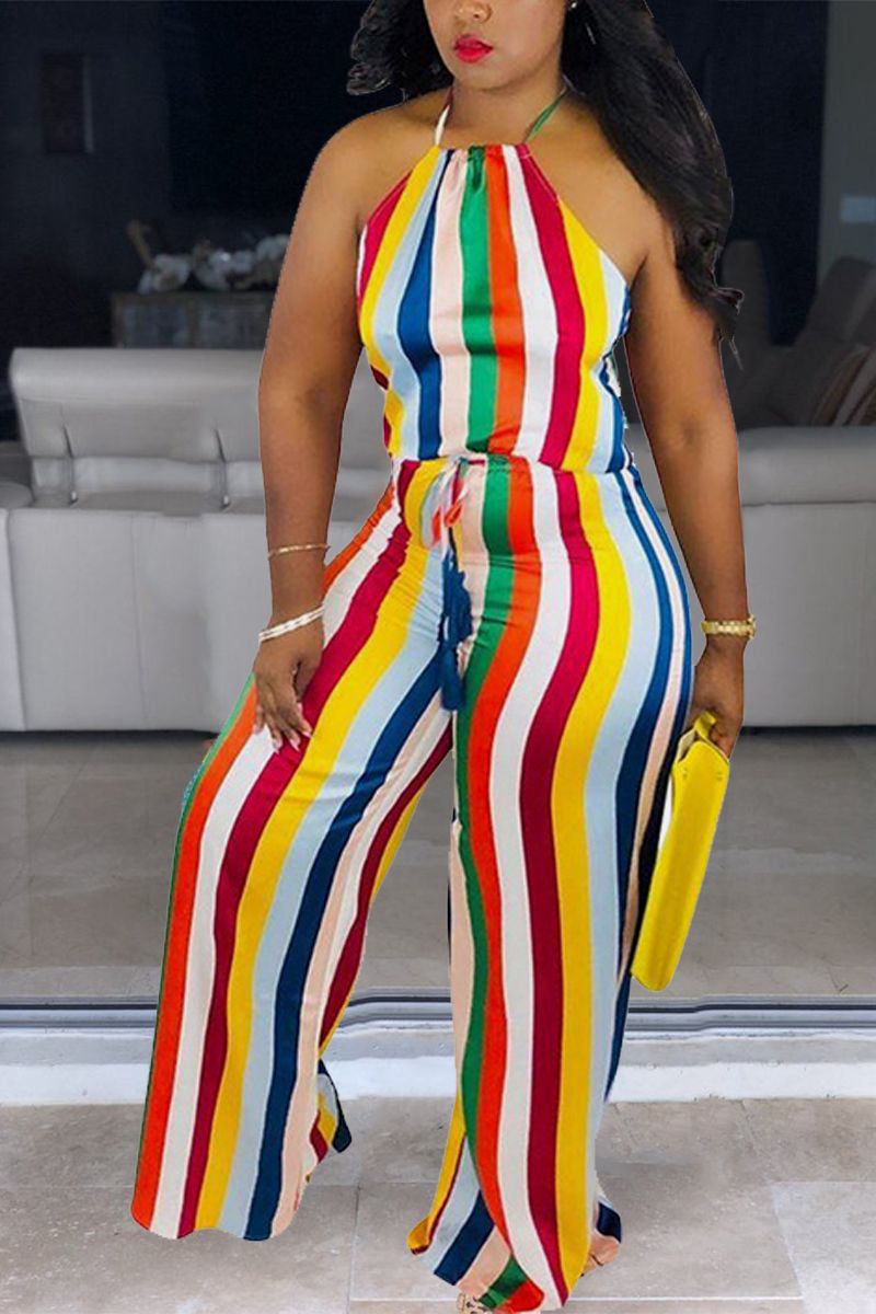 Colorful Pinstriped Drawstring Waist Halter Jumpsuit