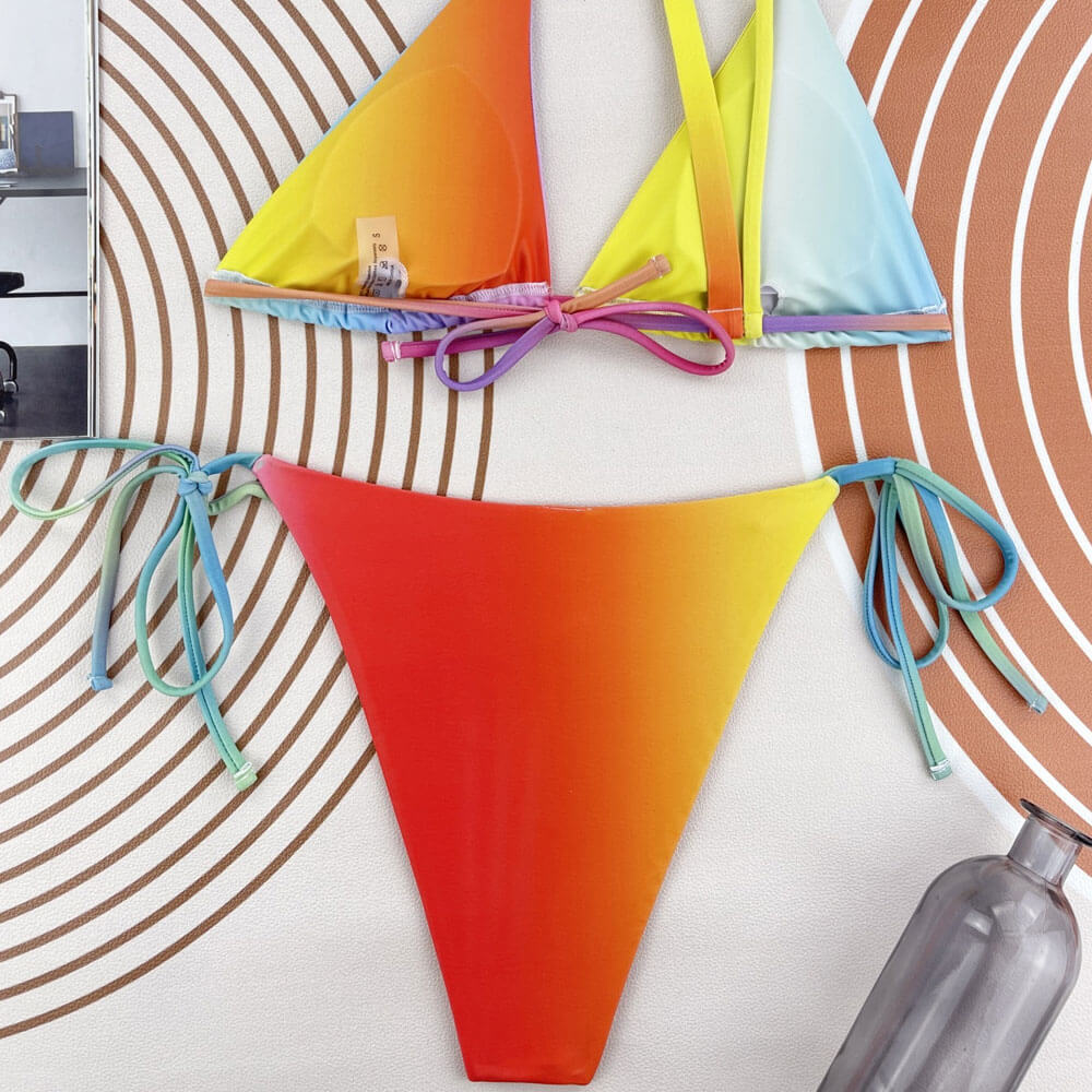 Behold the effortlessly cool look of the summer: an asymmetrical bikini set in rainbow colors. The asymmetrical triangle swim top with removable soft pads features a spaghetti strap and a wide strap with buckle trim on the shoulders, creating a unique and fashionable look. Paired with the colorful Brazilian cheeky bikini bottom, adorned with double-layered design and tie side strings, this gradient color bikini set is perfect for women who want to embrace their vibrant.