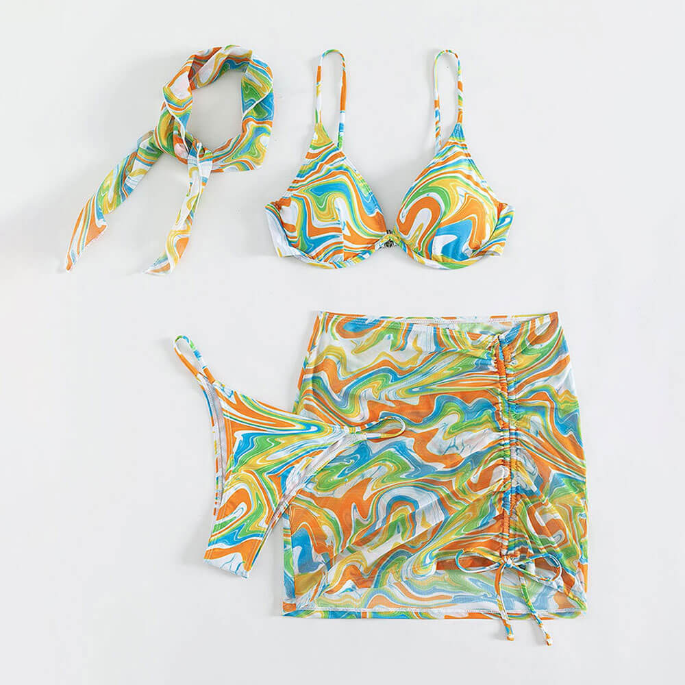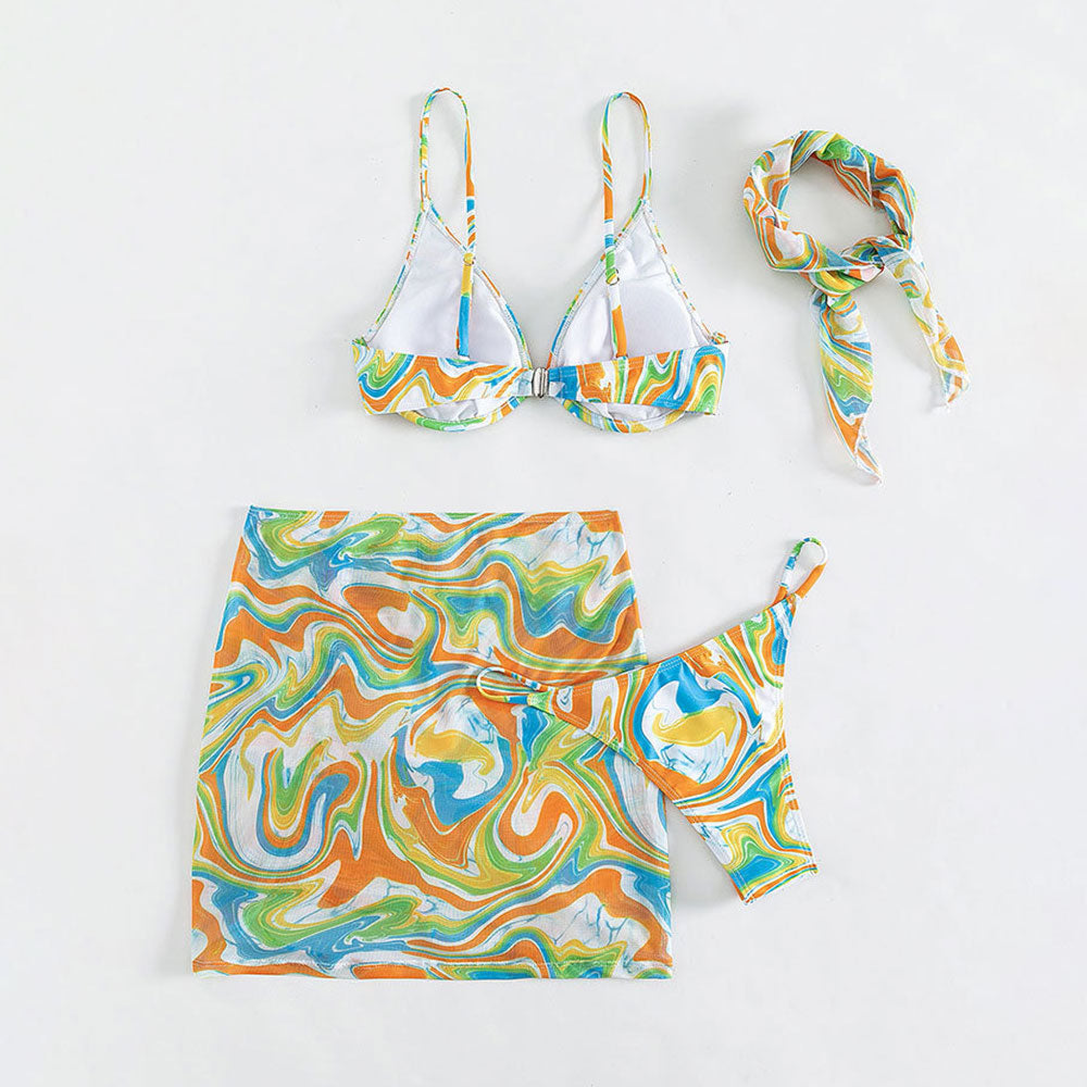Colorful Wavy String Cheeky Underwire Brazilian Three Piece Bikini Swimsuit