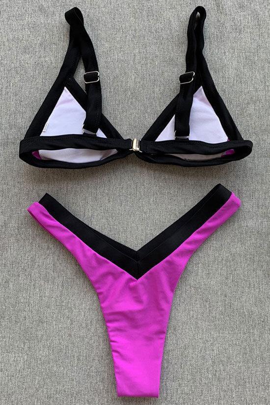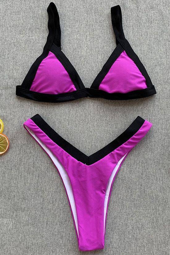 Attractive two piece bikini set featuring a triangle bikini swim top with detachable pad cups, slide closure on the back and suspender shoulder straps, pairing with a high cut bikini thong bottom with contrast color waistband.