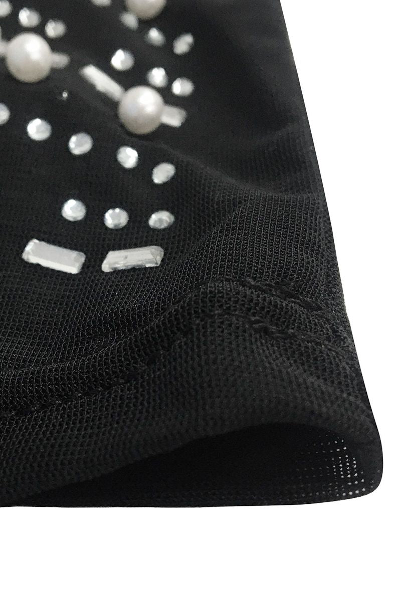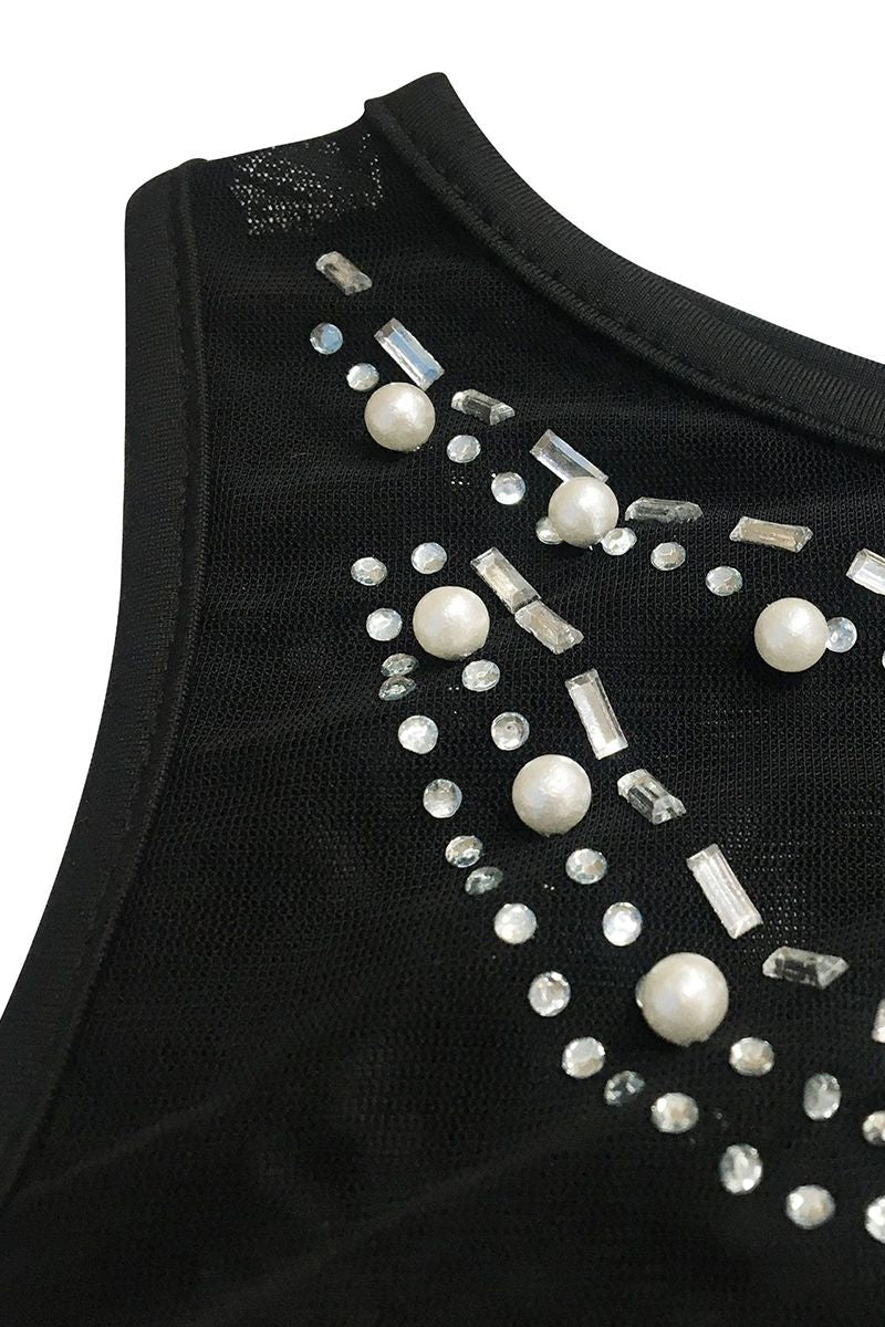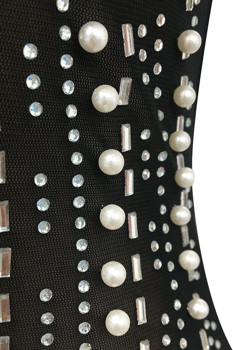 Contrast Mesh Rhinestone & Faux Pearls Decor Bodycon Dress