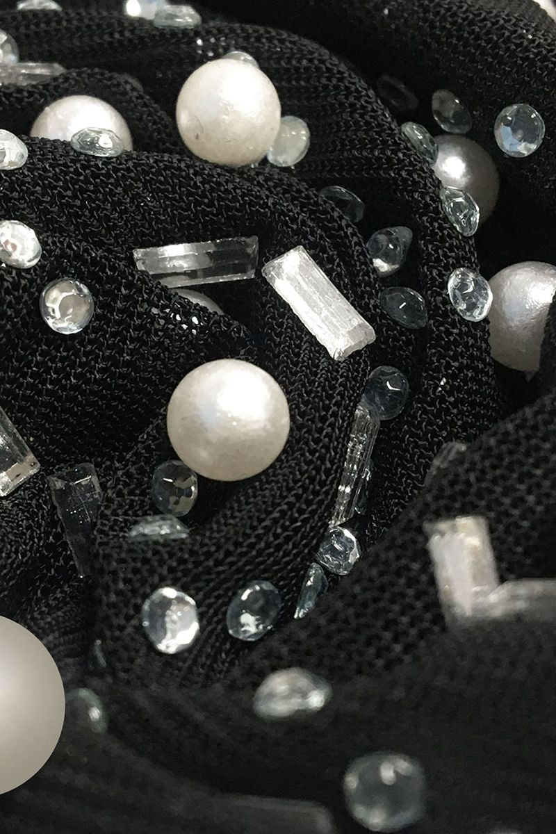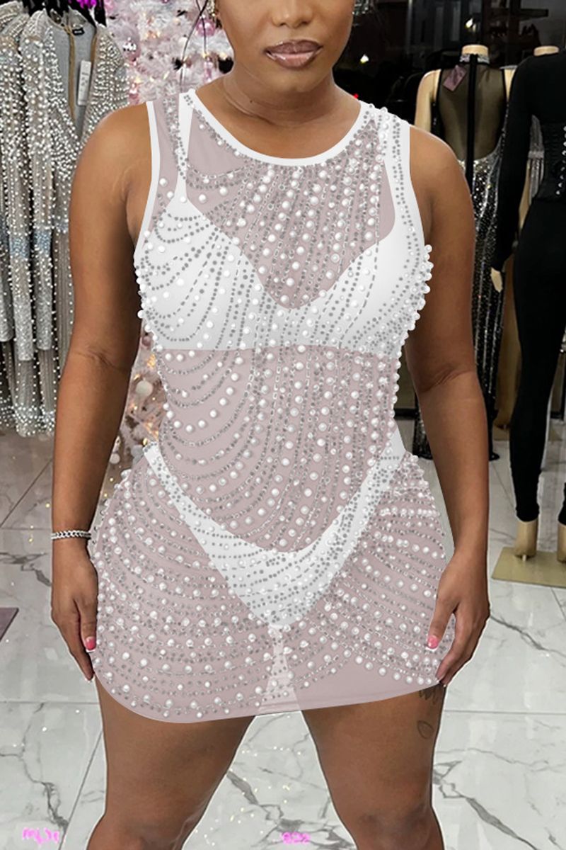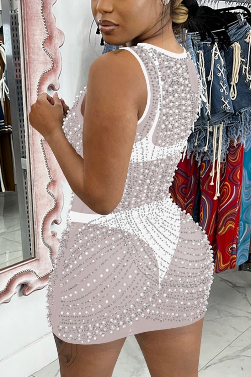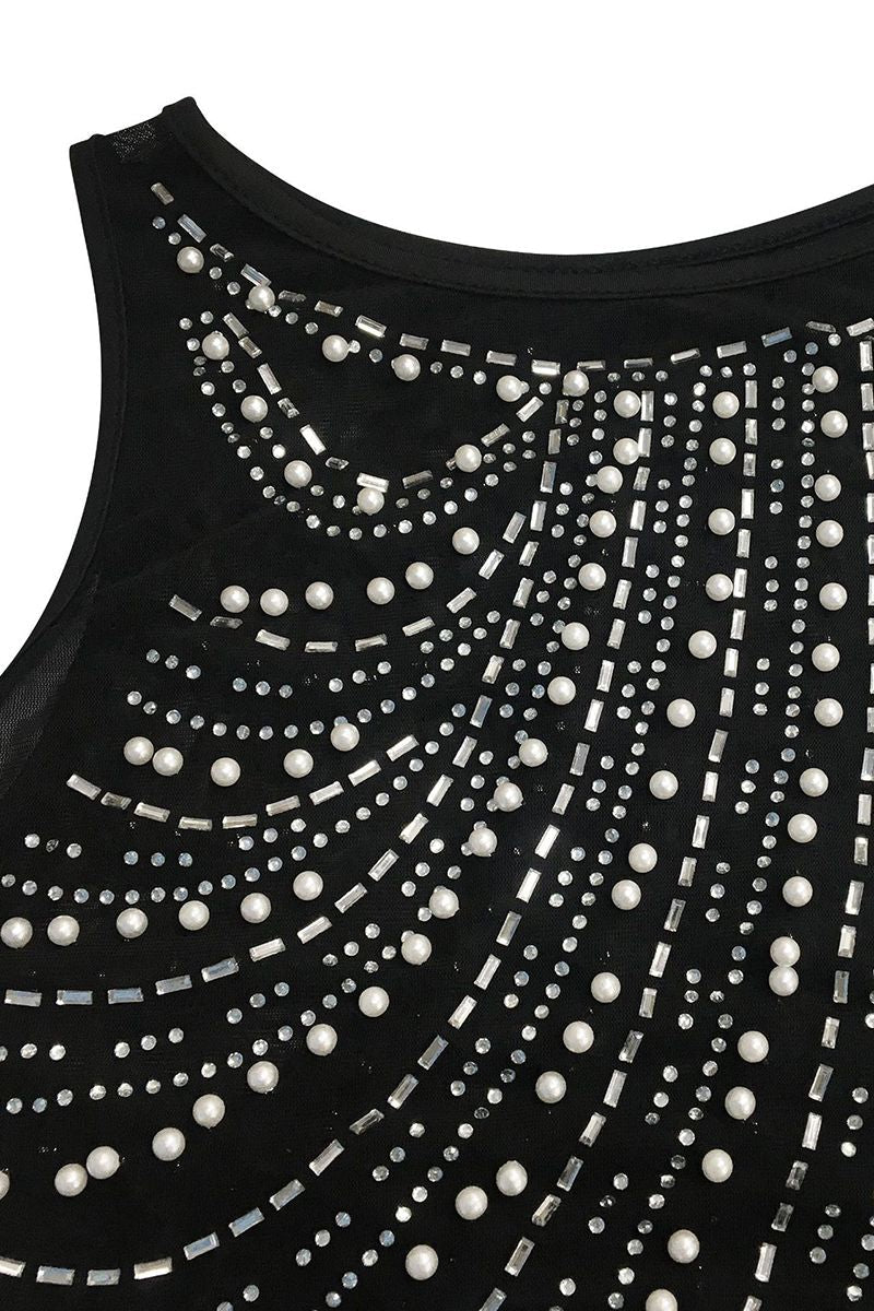 Contrast Mesh Rhinestone & Faux Pearls Decor Bodycon Dress