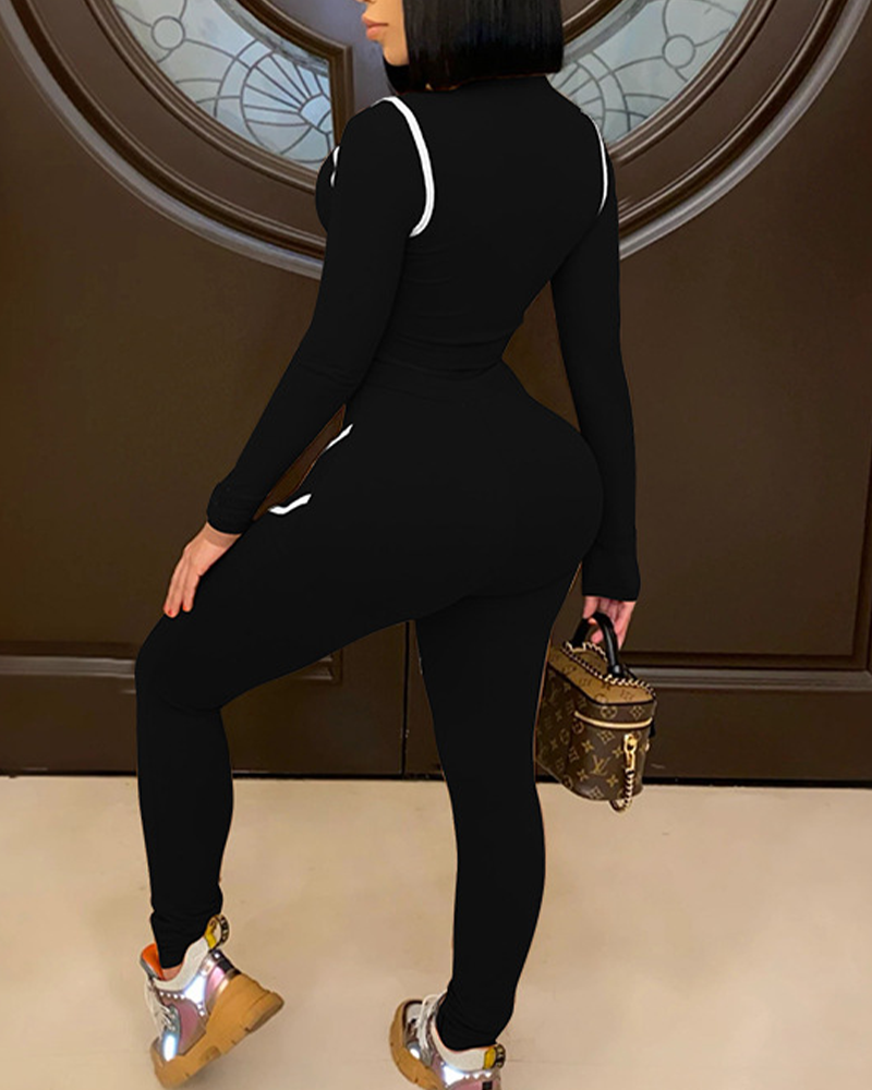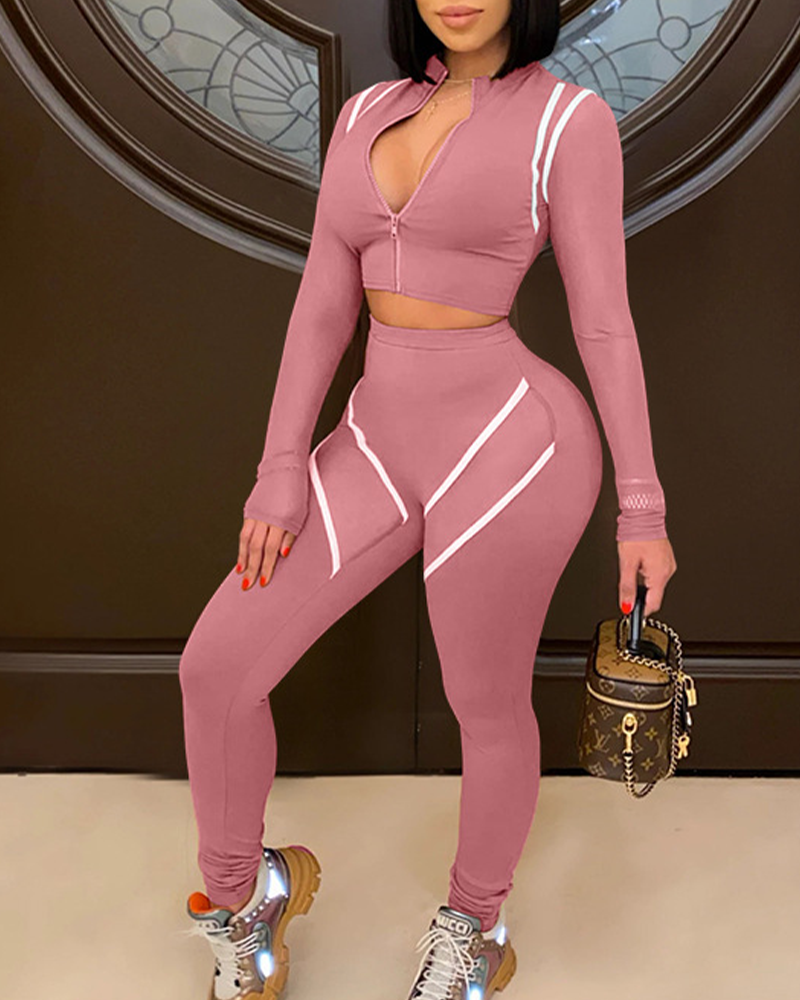 Contrast Piping Zip Up High Waist Top & Pants Set