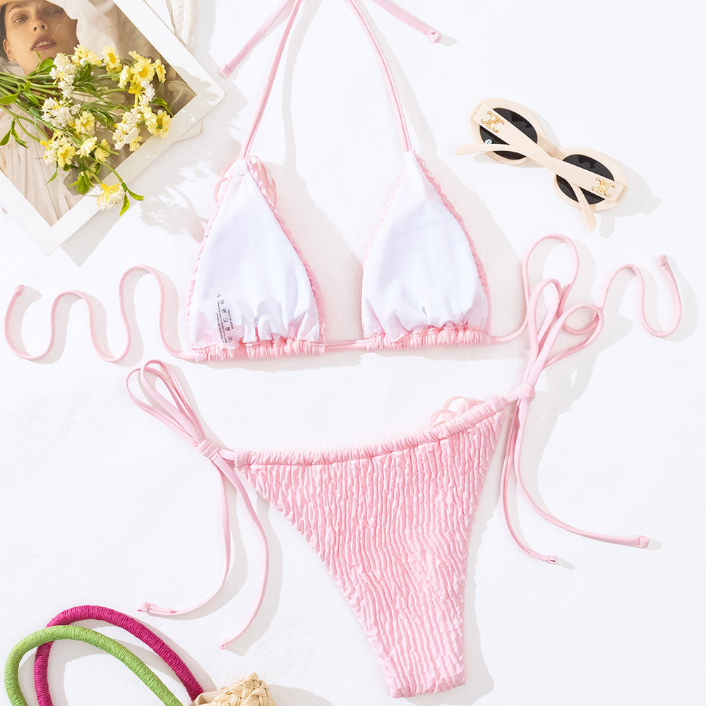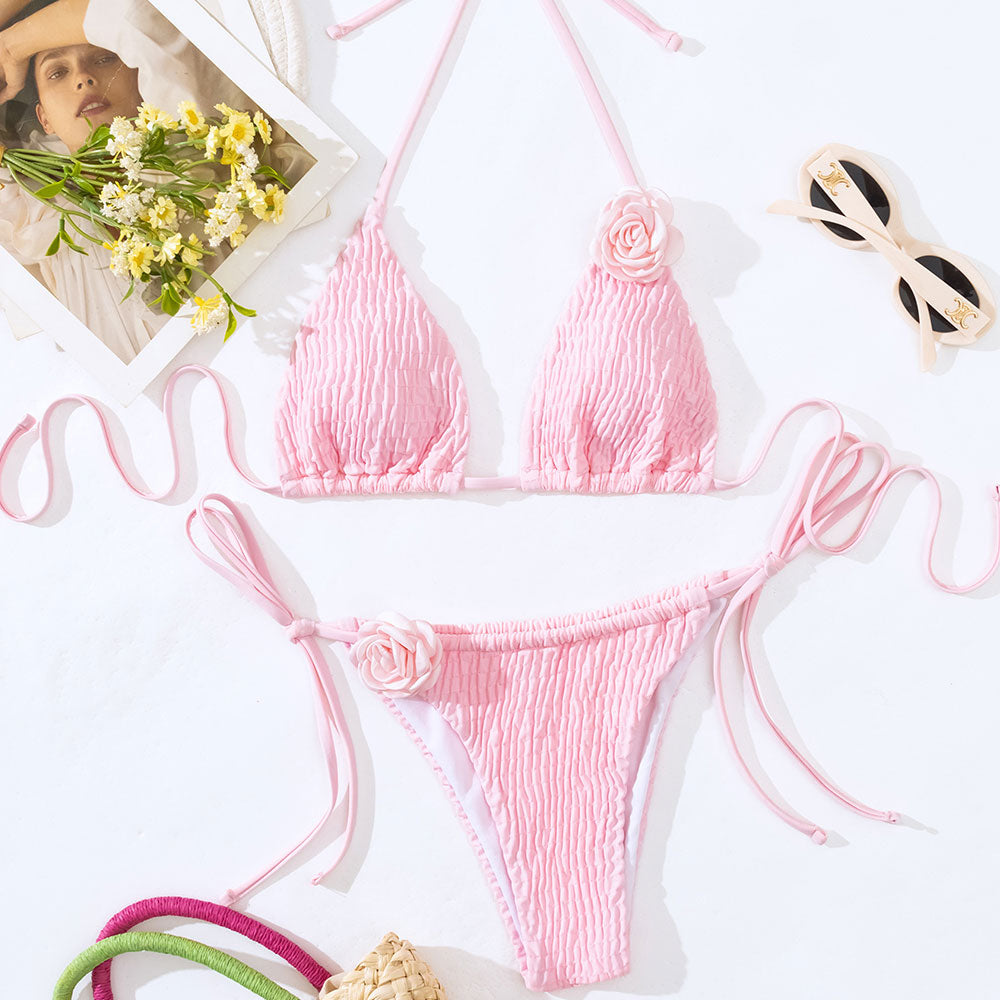 This sweet pink popcorn bikini set is your new beach day bestie! Flaunting a fun, sliding triangle top with a halter neck, it's as flattering as it is playful. The crinkled fabric is jazzed up with pretty 3D flower and a chic back tie, turning heads wherever you go. Comfort? We've got you covered with removable soft padding. The cheeky, rosette-trimmed bikini bottom, with strings tied at the sides, ensures a perfect fit. Fully lined and irresistibly textured, this set is a beach day dream come true!