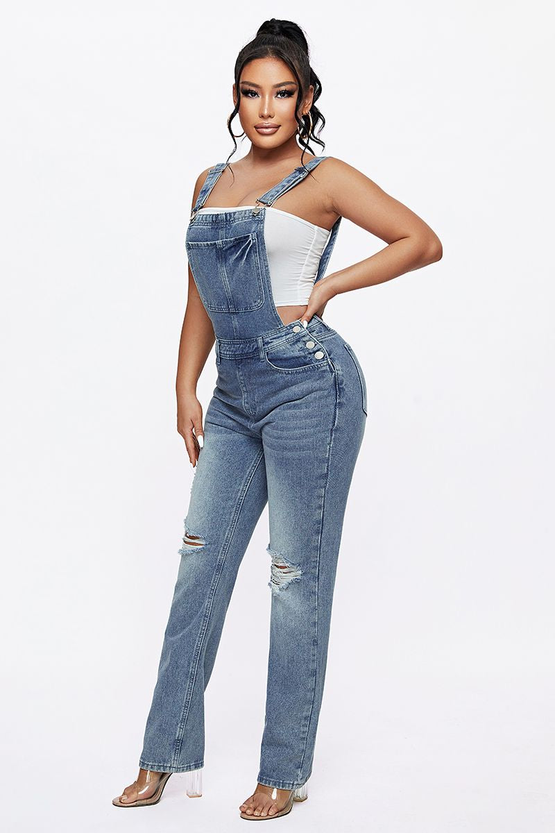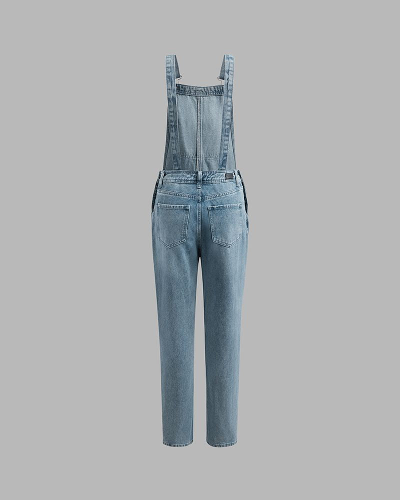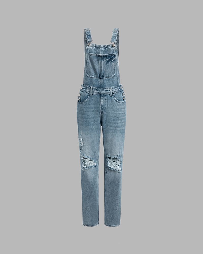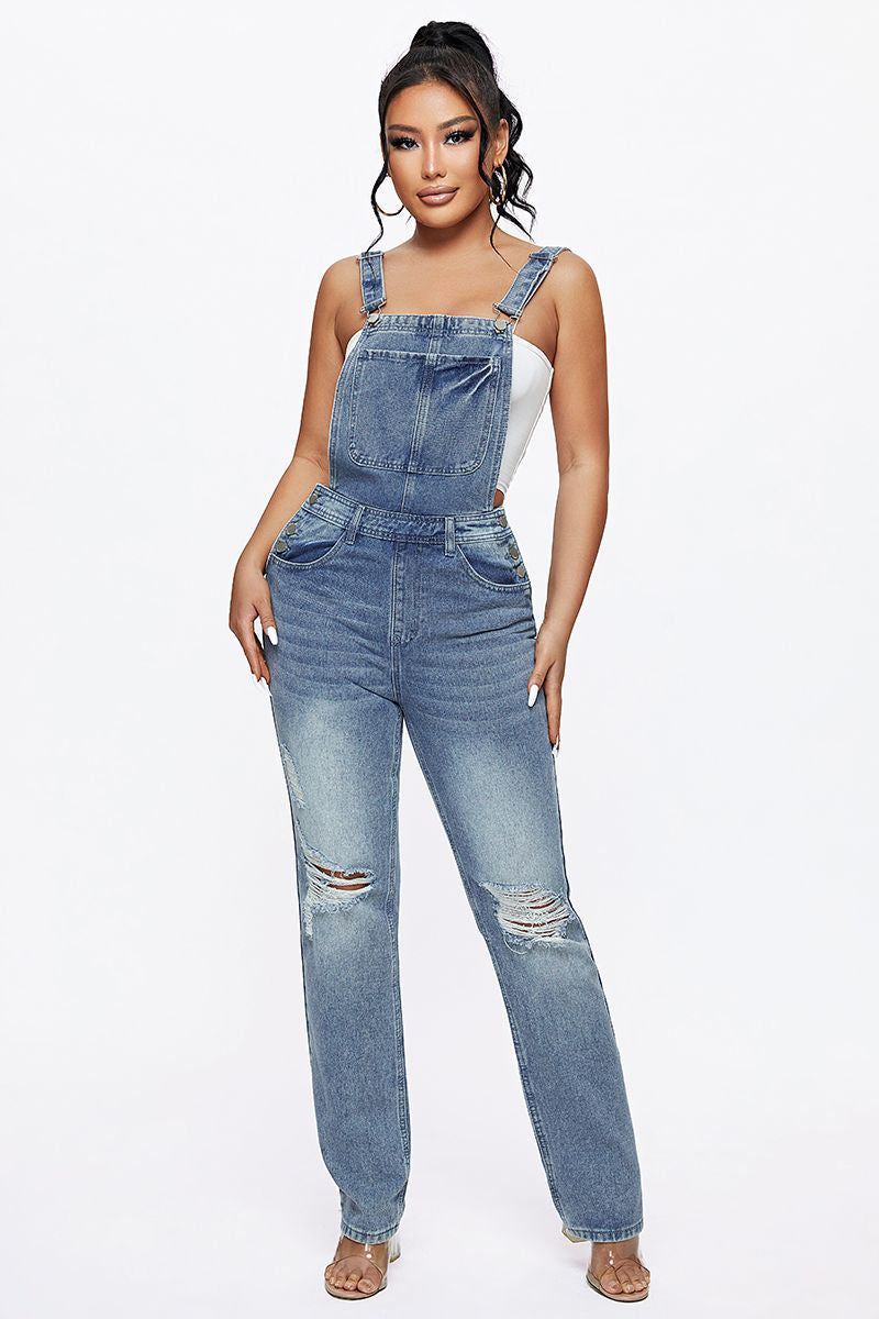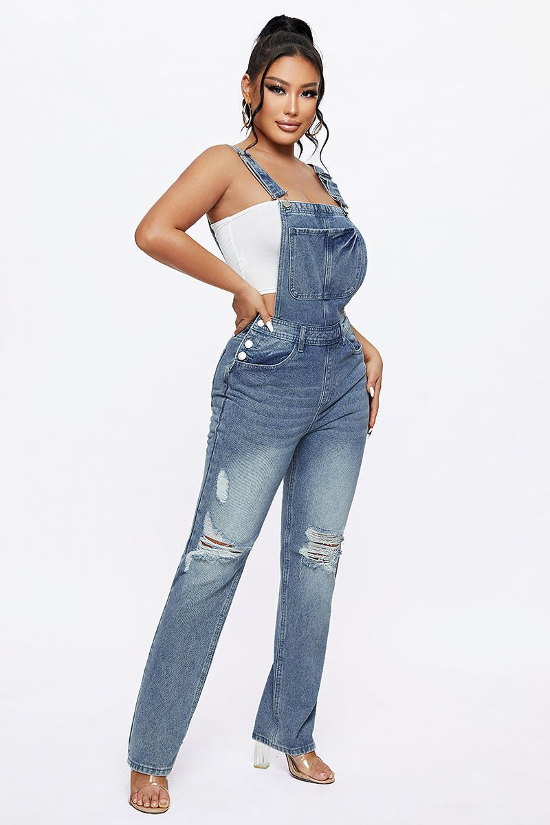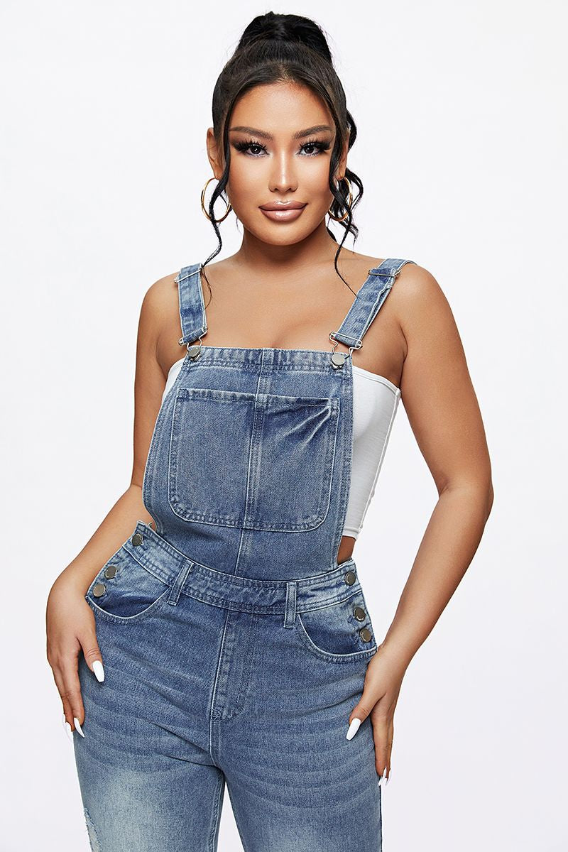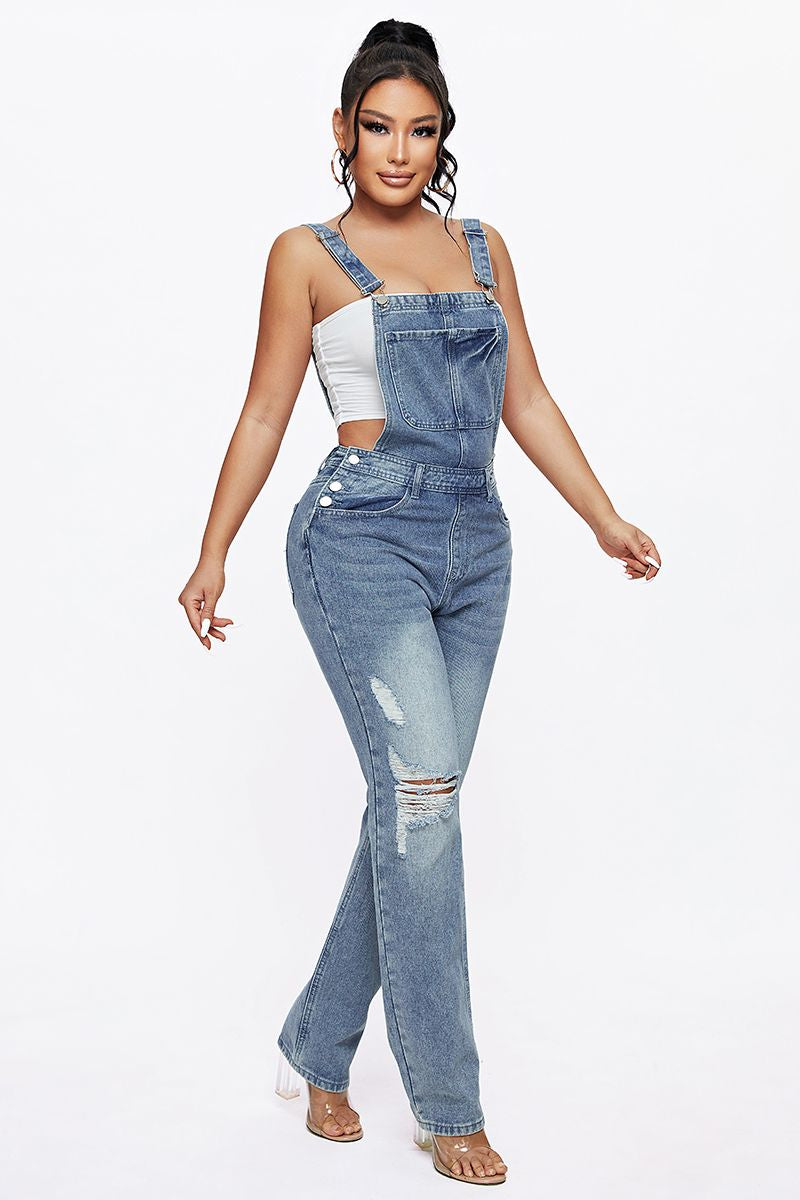 Distressed Knee Pocket Front Adjustable Strap Denim Overall Jumpsuit