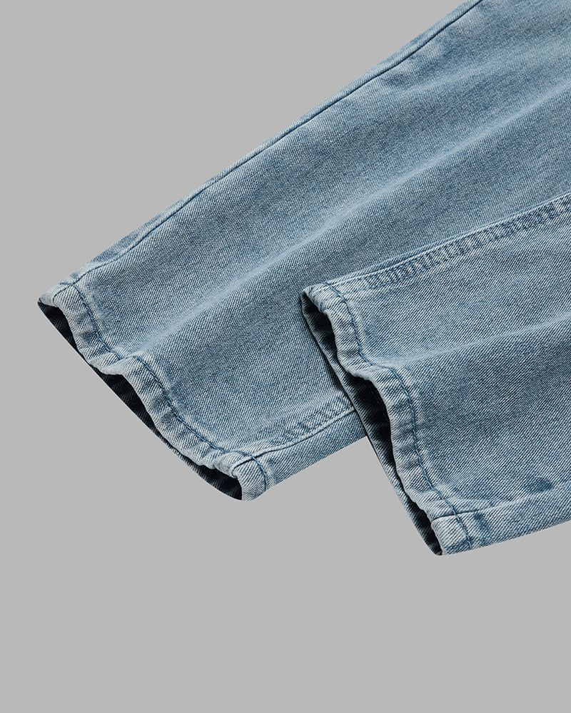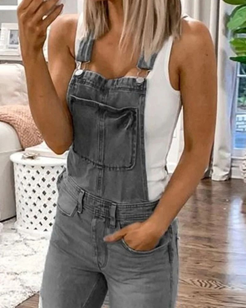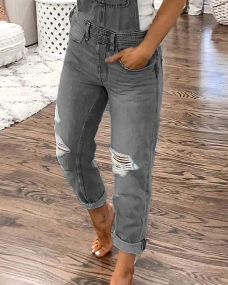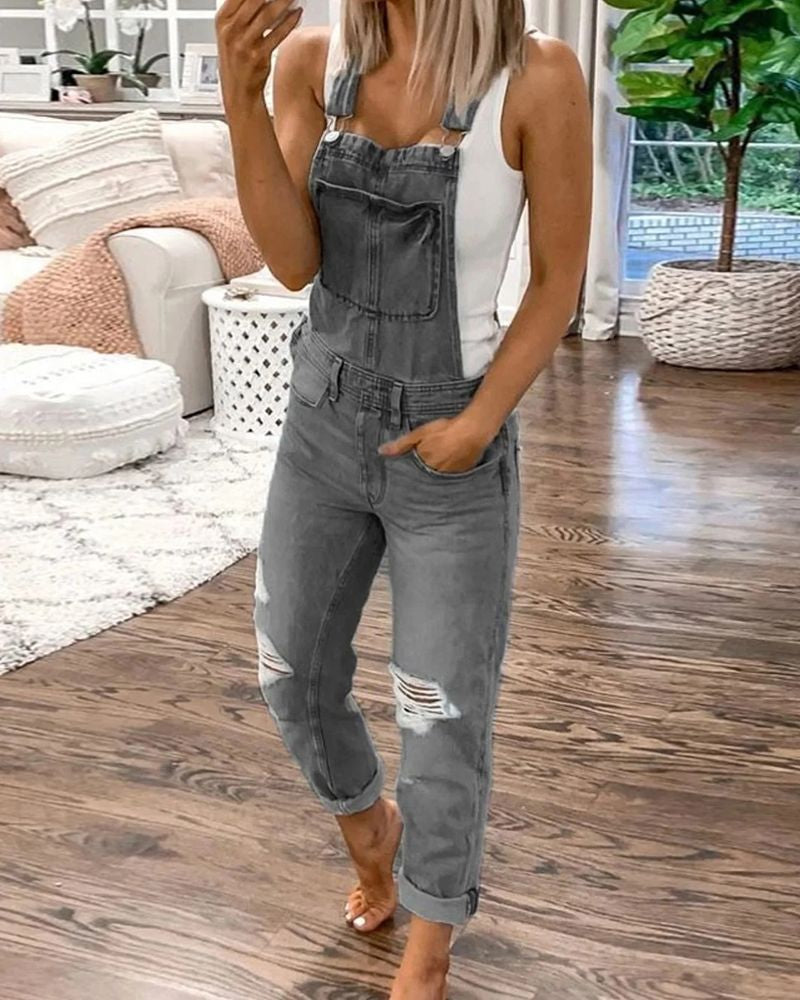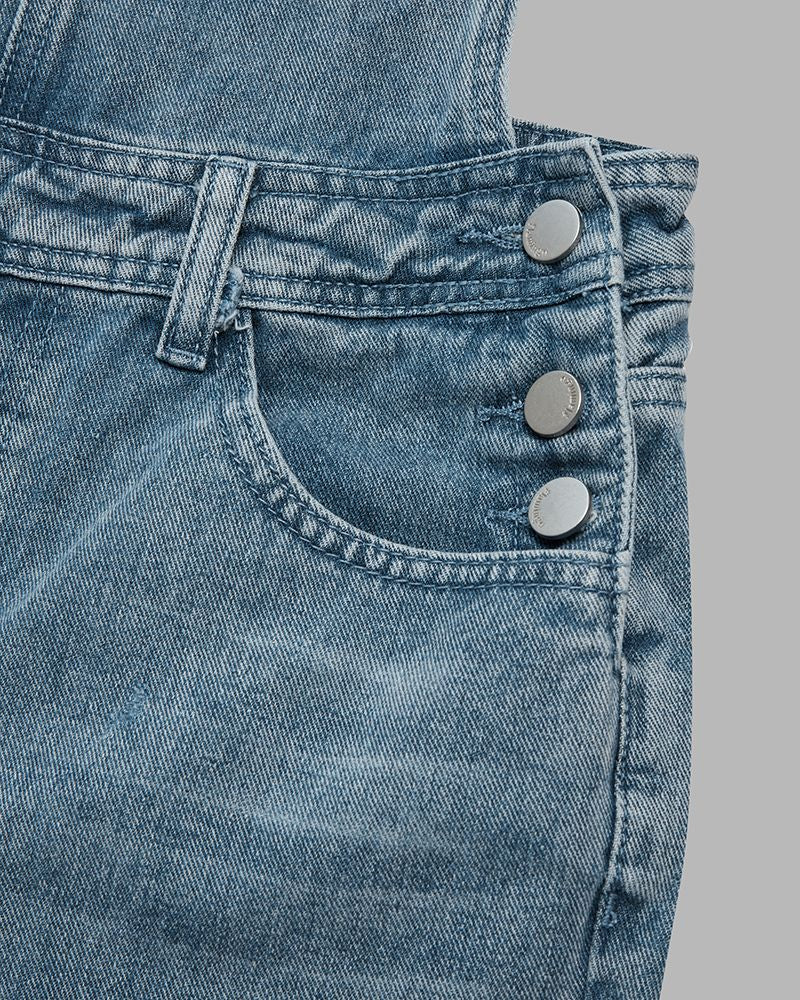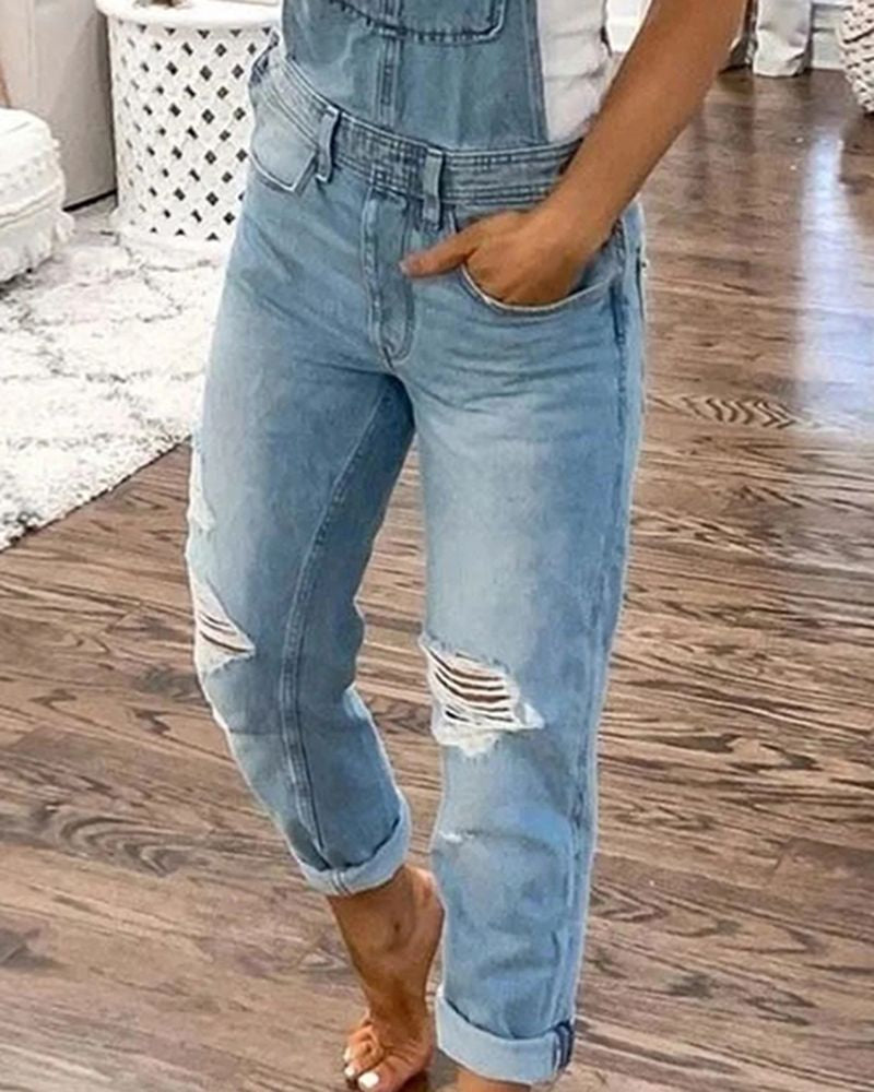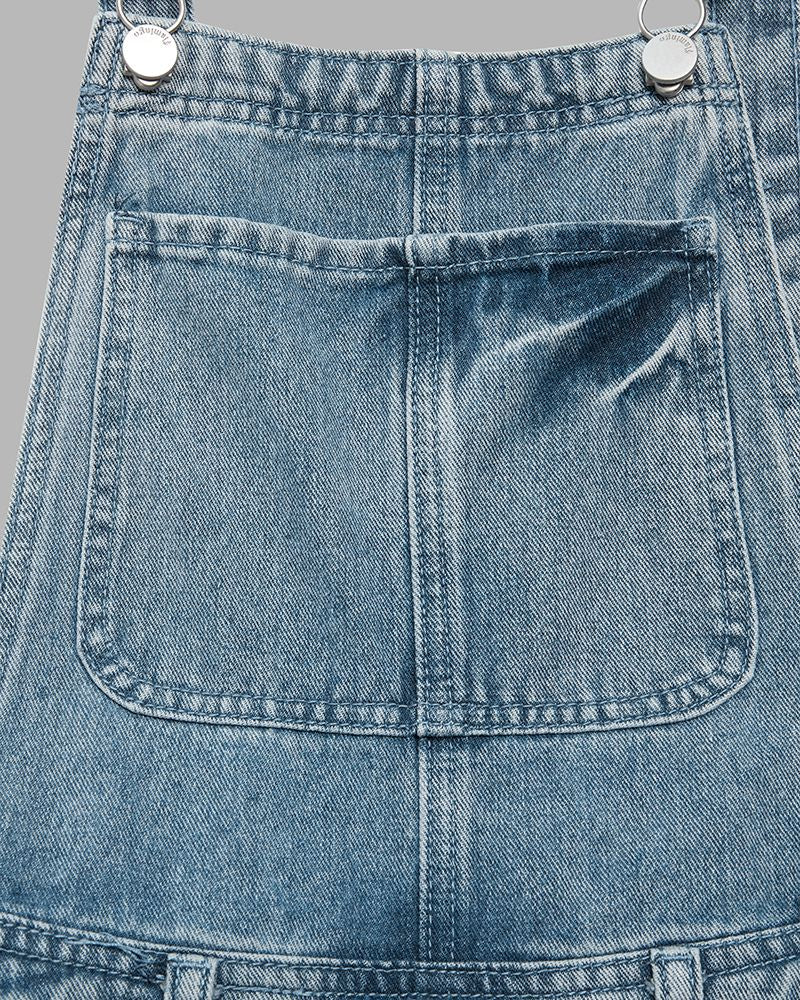 Distressed Knee Pocket Front Adjustable Strap Denim Overall Jumpsuit