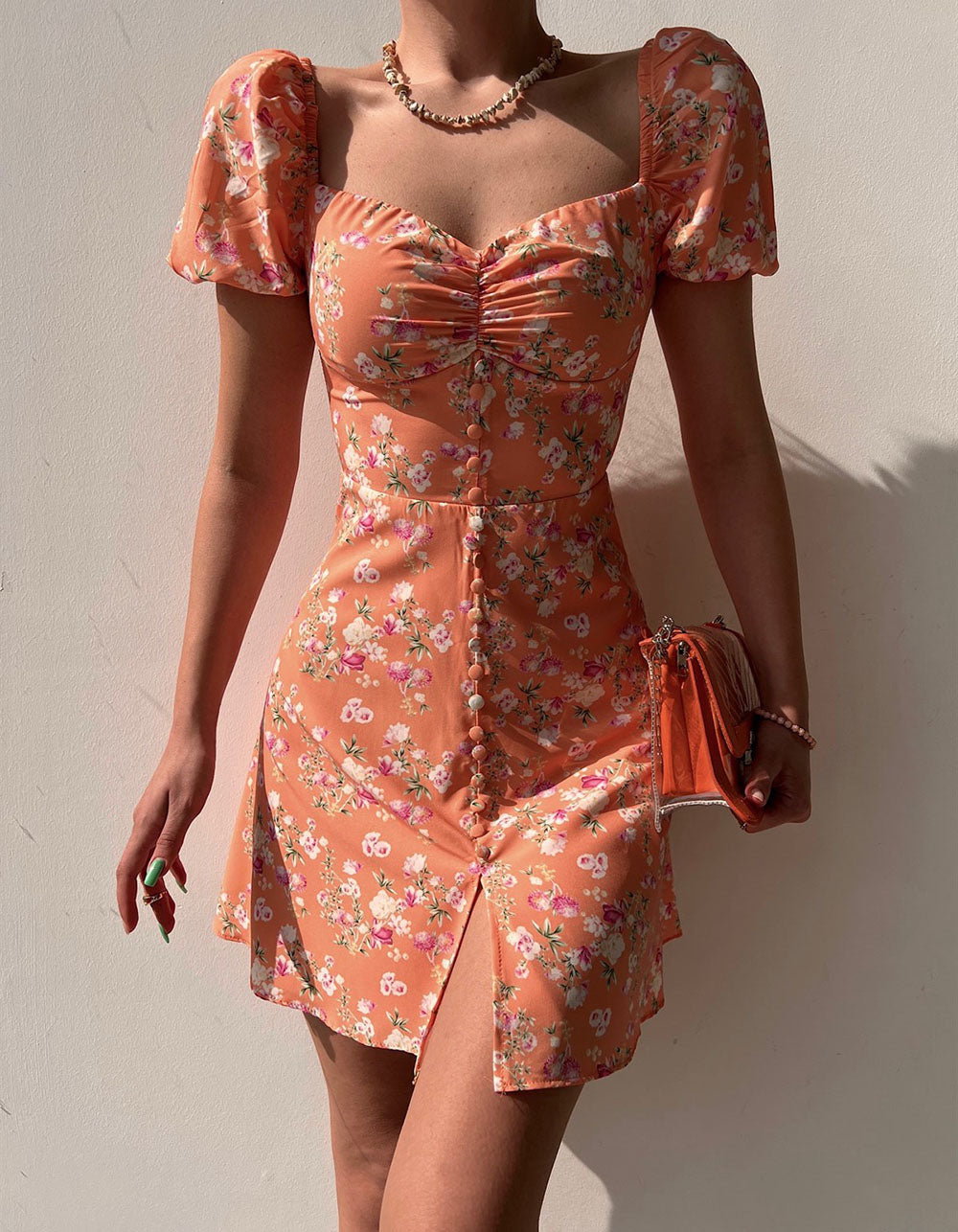This Disty Floral Print Slits V-Neck Short A Line Dress offers a versatile style with a cute, casual and elegant look. Made from polyester fabric with a slight stretch, this dress has a mid-waist fit, ruffle hem shape and a V-neck short sleeve. The dress has a button front, printed pattern and slits for a unique touch.