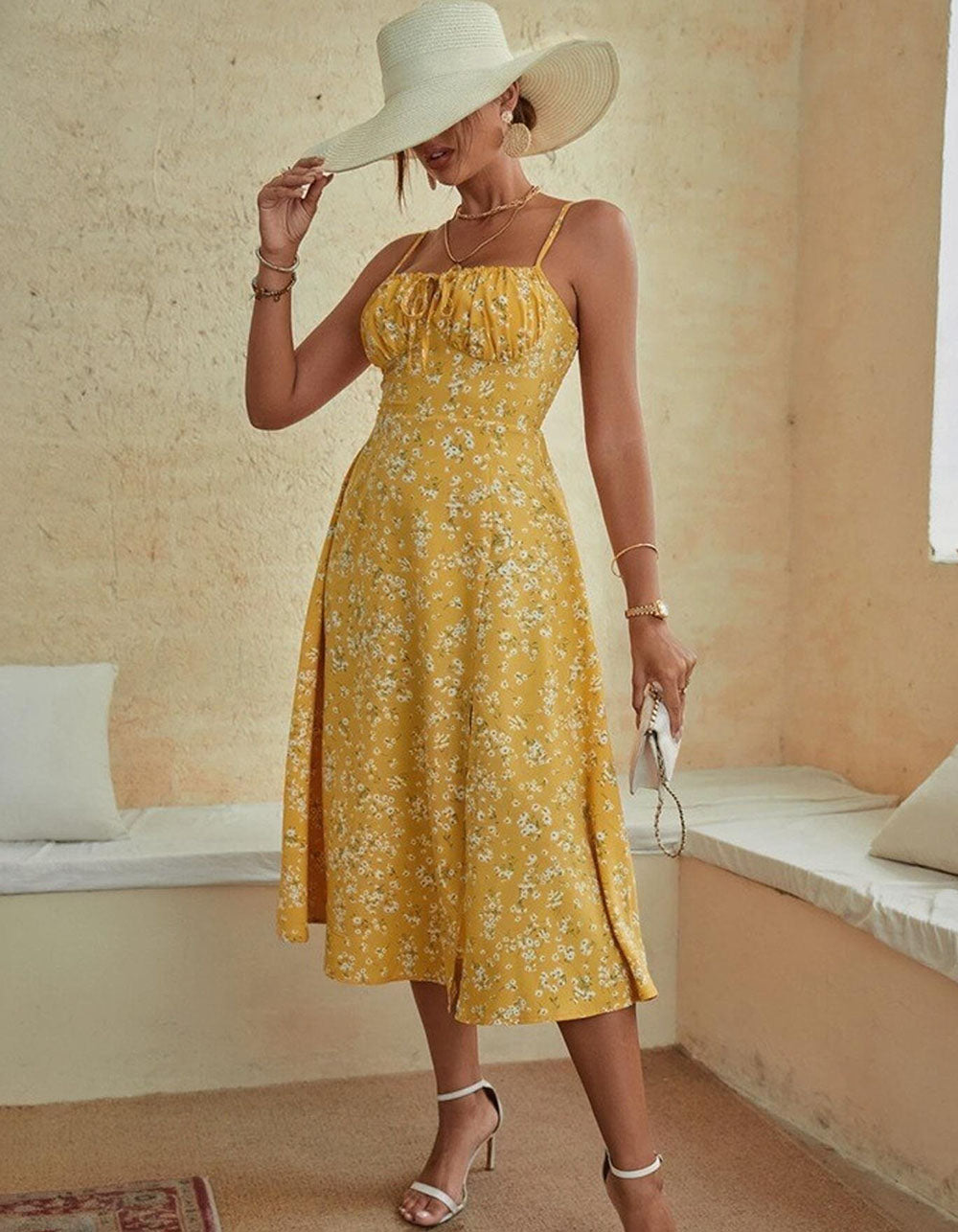 Disty Floral Strap Backless Slits Loose Midi A-line Dresses