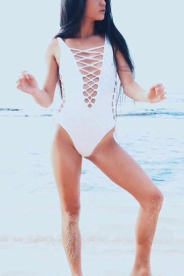 White Lace Up Strappy Crisscross Sexy One Piece Swimsuit