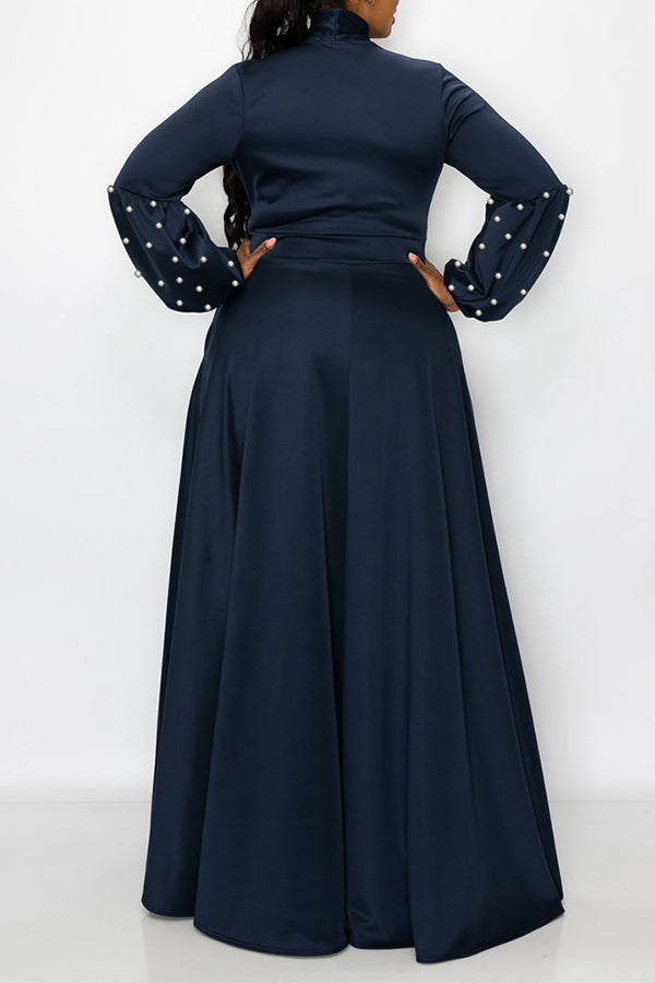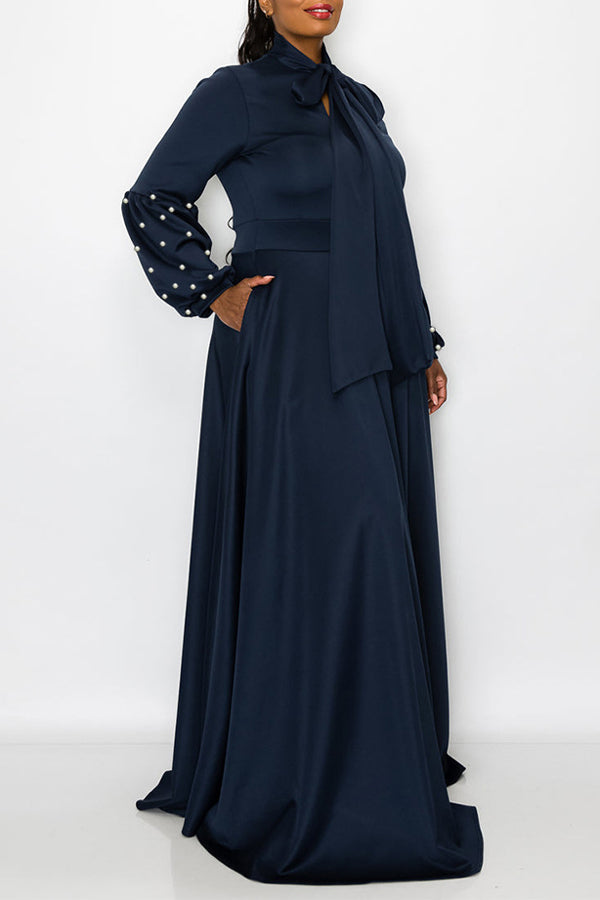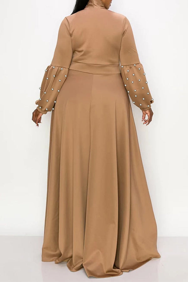 Elegant Lace-Up Neck Long Sleeve Beaded Plus Size Maxi Dress