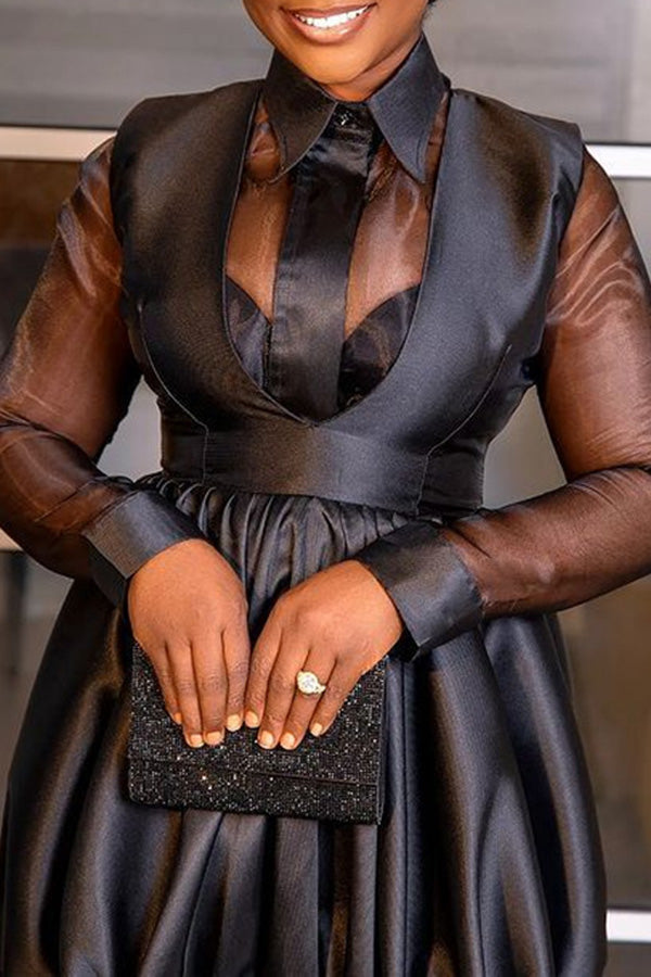 Elegant Solid Color Lapel Sheer Mesh Stitching Long Sleeve A-Line Maxi Dress