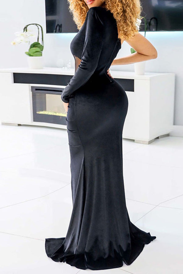 Elegant Solid Color Mesh Stitching Pleated One Sleeve Slim Fit Slit Maxi Dress