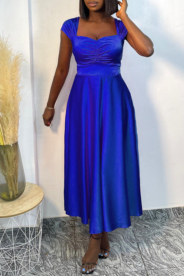Elegant V-neck Ruched Short Sleeve Silky Maxi Dress