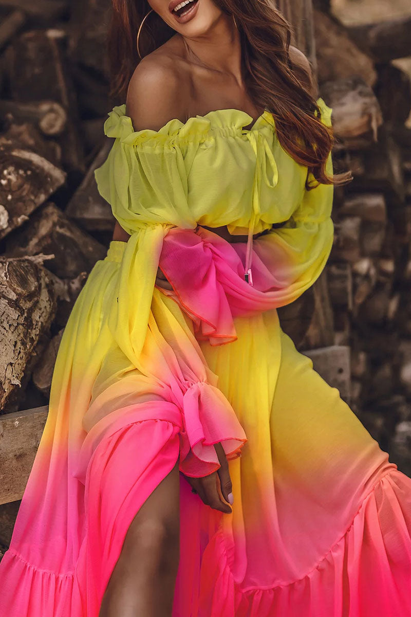 Fashion Casual Print Split Joint Off the Shoulder Long Sleeve Two Pieces