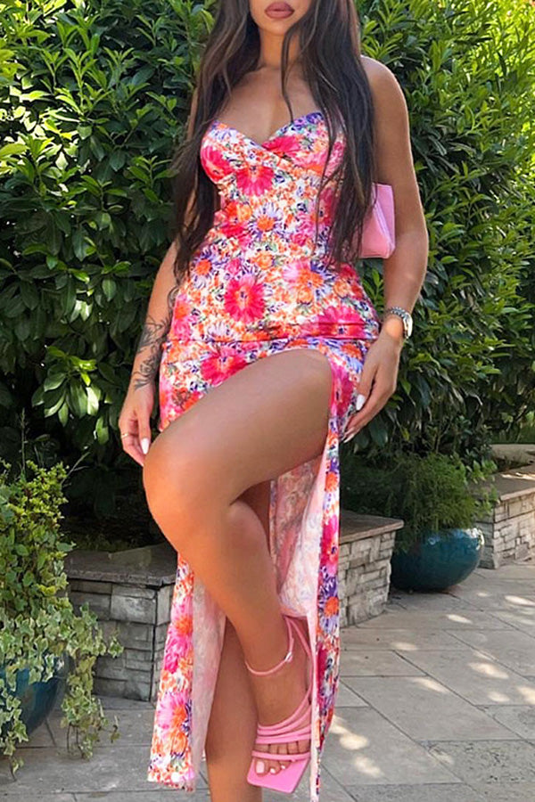 Fashion Digital Printing V-Neck Sling Mid-length Slit Sling Dress