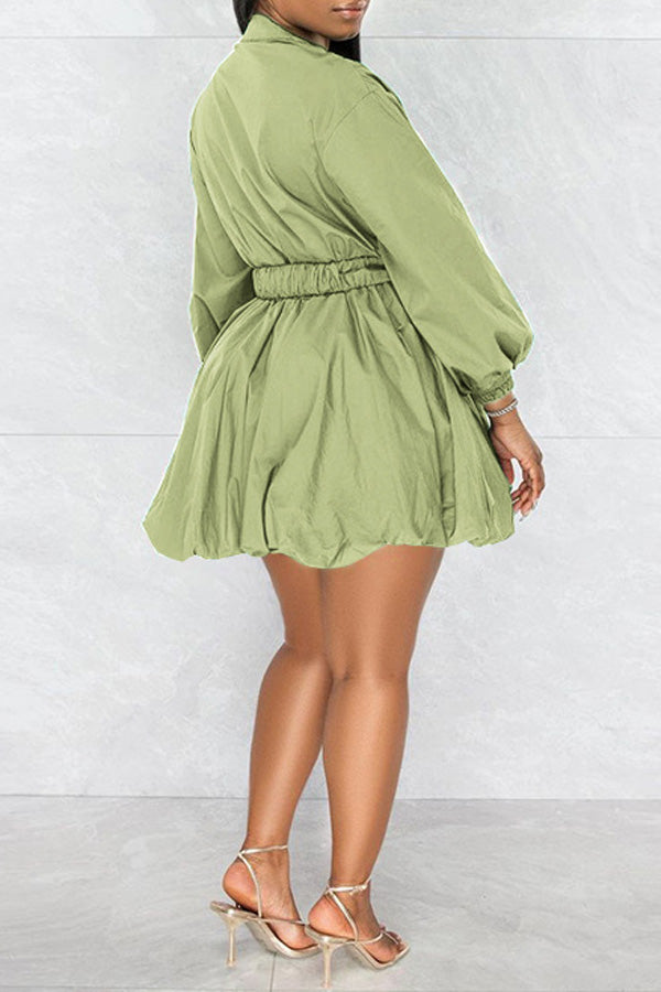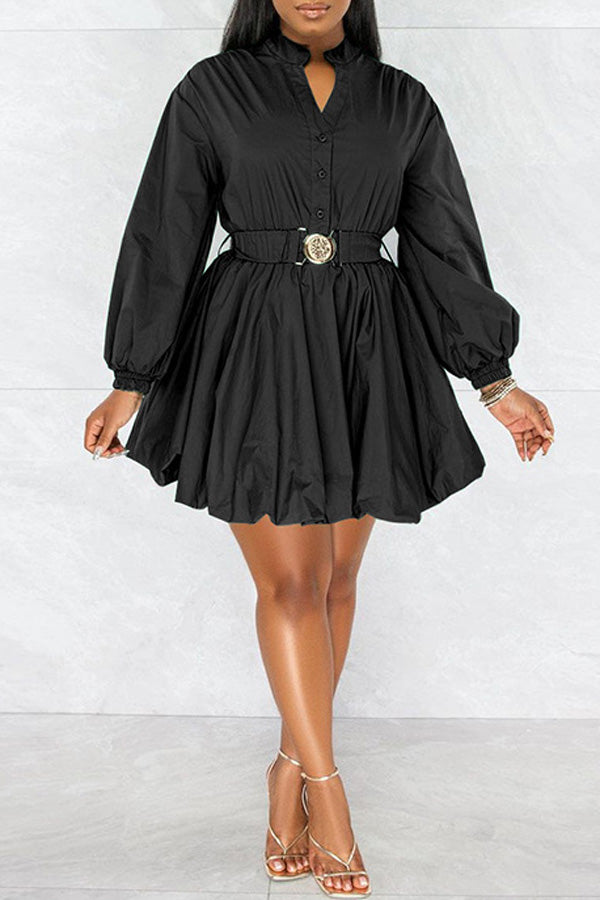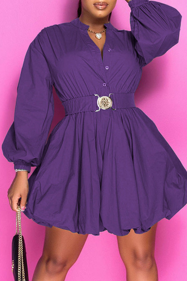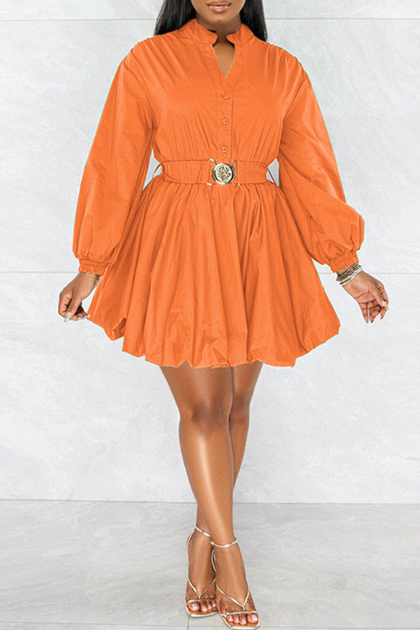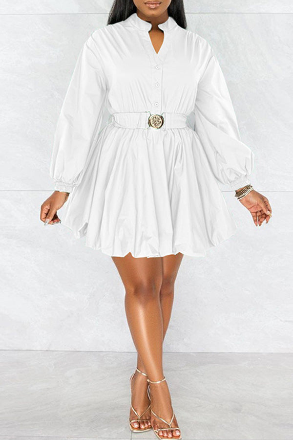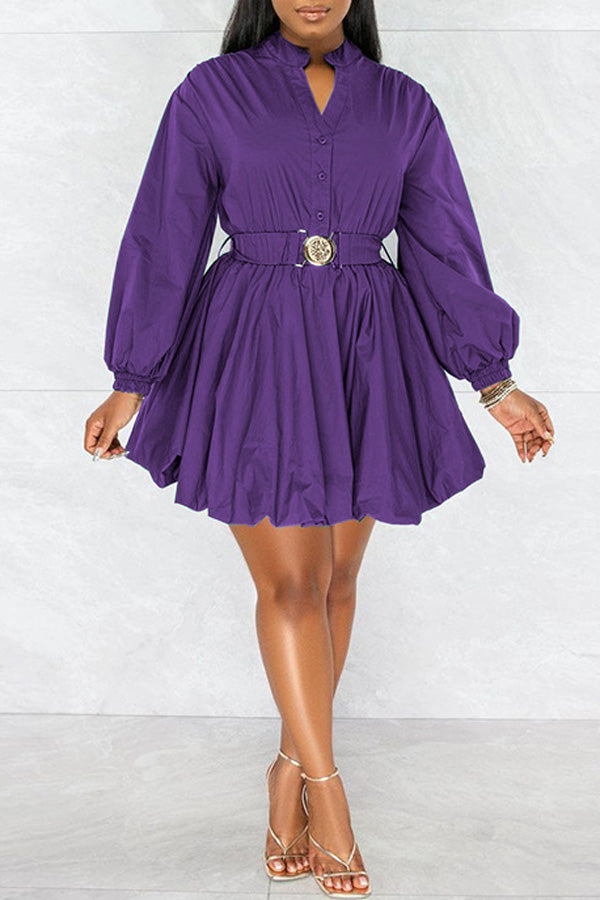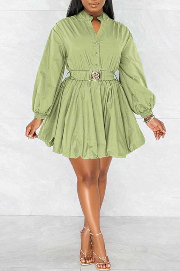 Fashion Long Sleeve Solid Color V-neck Belt A-Line Mini Dress