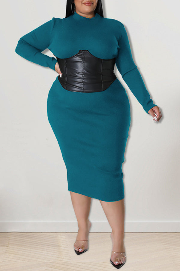 Fashion Plus Size Faux Leather Patchwork Slim Fit Round Neck Midi Dress