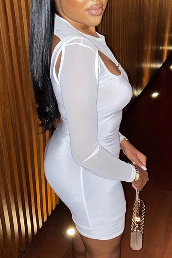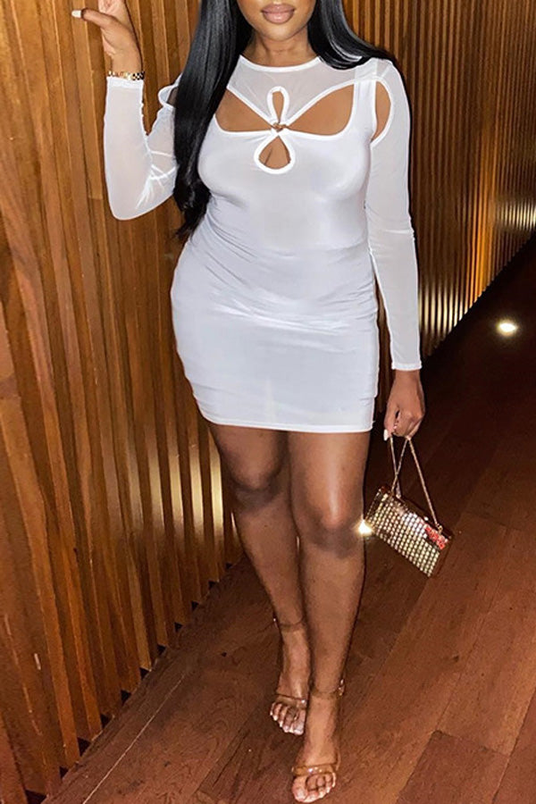 Fashion Sexy Round Neck Metal Ring Cutout Slim Fit Long Sleeve Dress