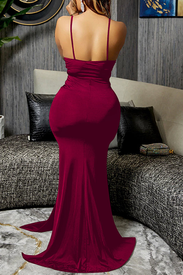Fashion Solid Color Elegant Sexy V-Neck Sling Irregular Drape Long Dress