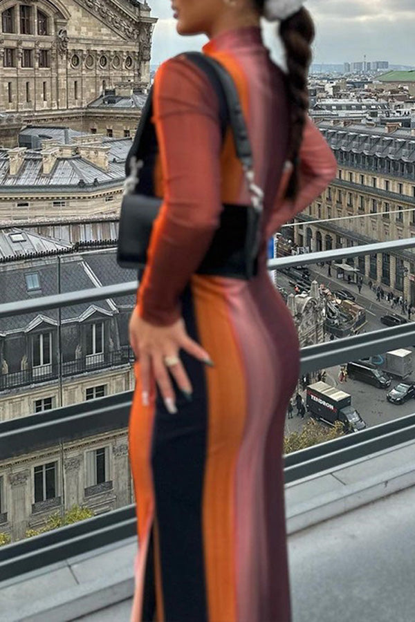 Fashion Stand Collar Long Sleeve Irregular Fashion Print High Waist Slim Fit Hip Dress