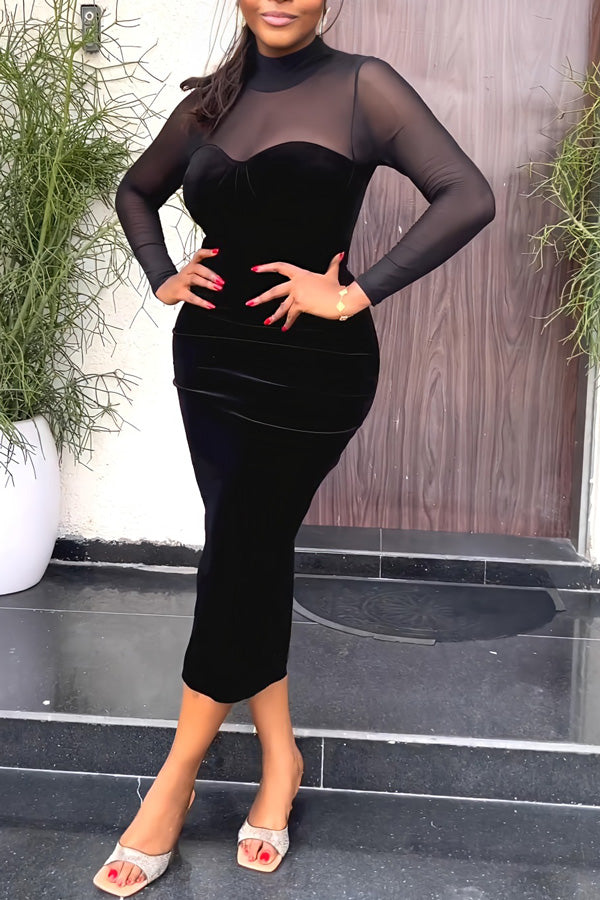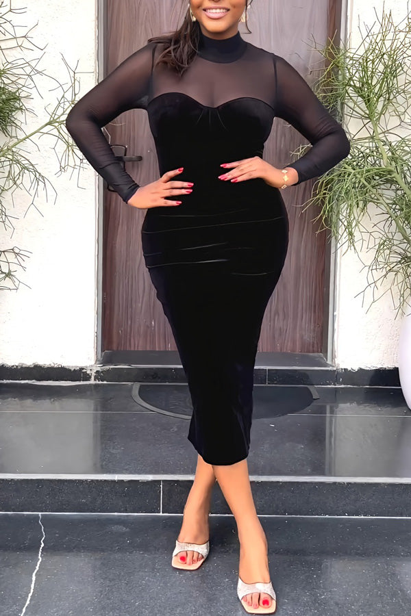 Feminine Mesh Stitching Long Sleeve Slim Fit Velour Solid Color Midi Dress