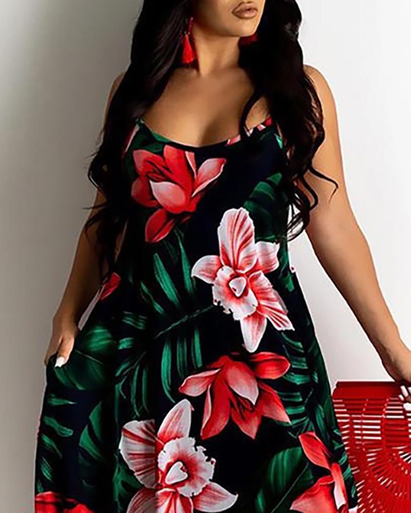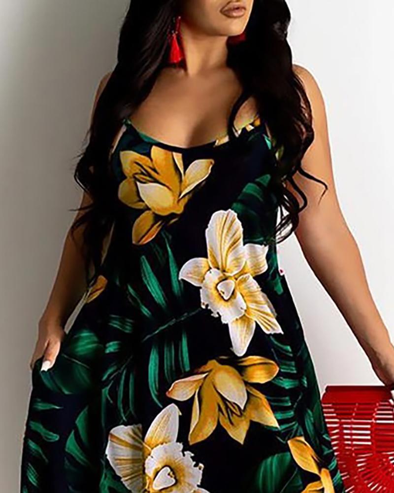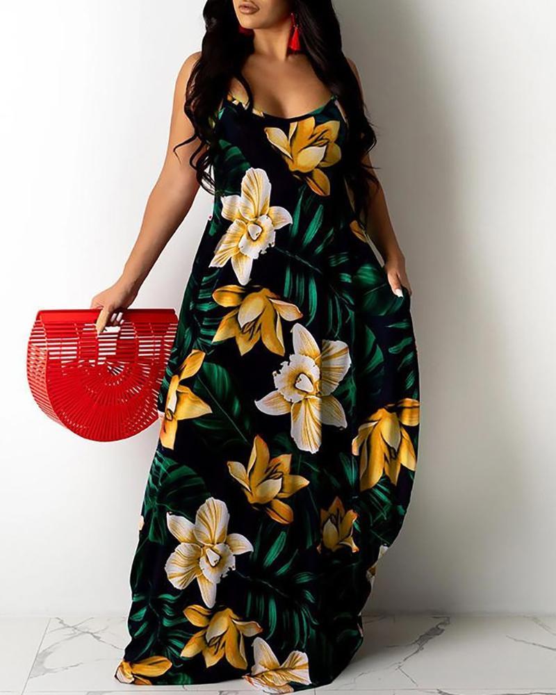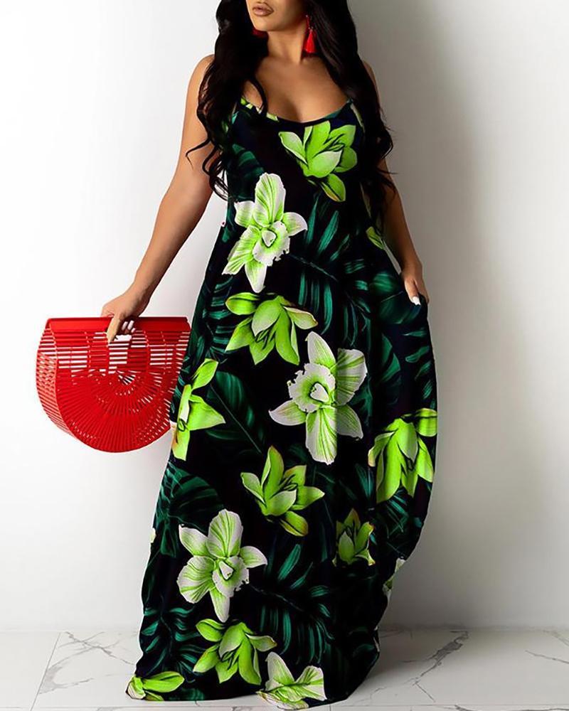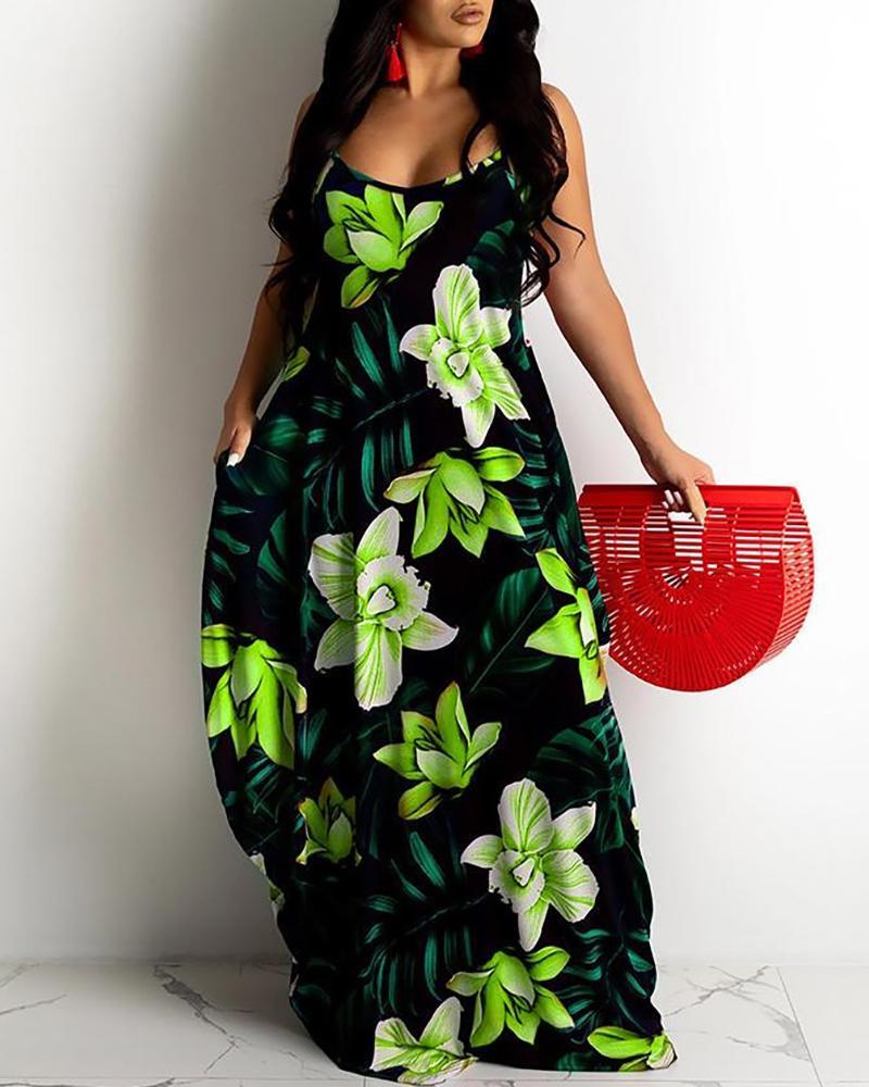 Floral Leaf Print Spaghetti Strap Maxi Dress