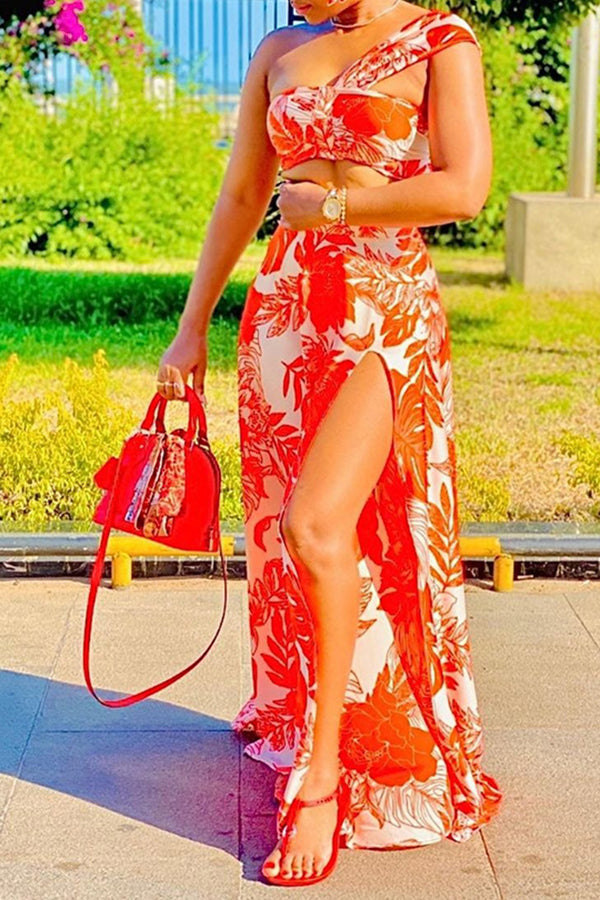 Floral One Shoulder Cutout Slit Plus Size Maxi Dress