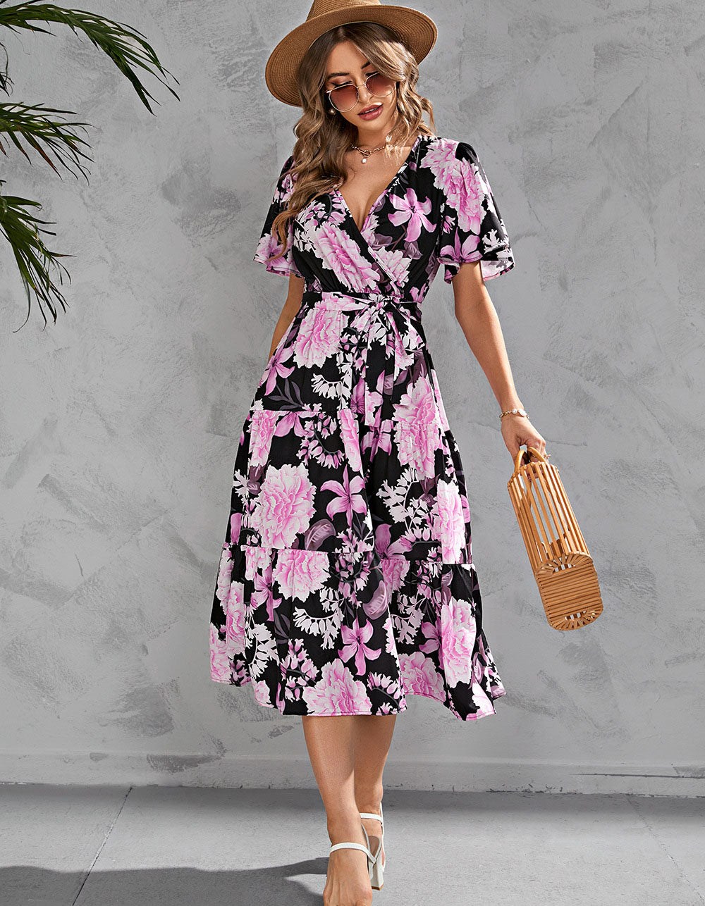 Floral Printed V Neck Short Sleeve Long A-Line Dresses
