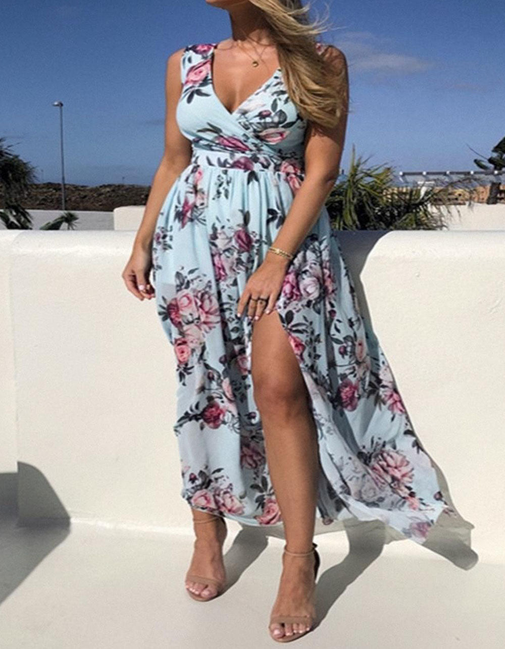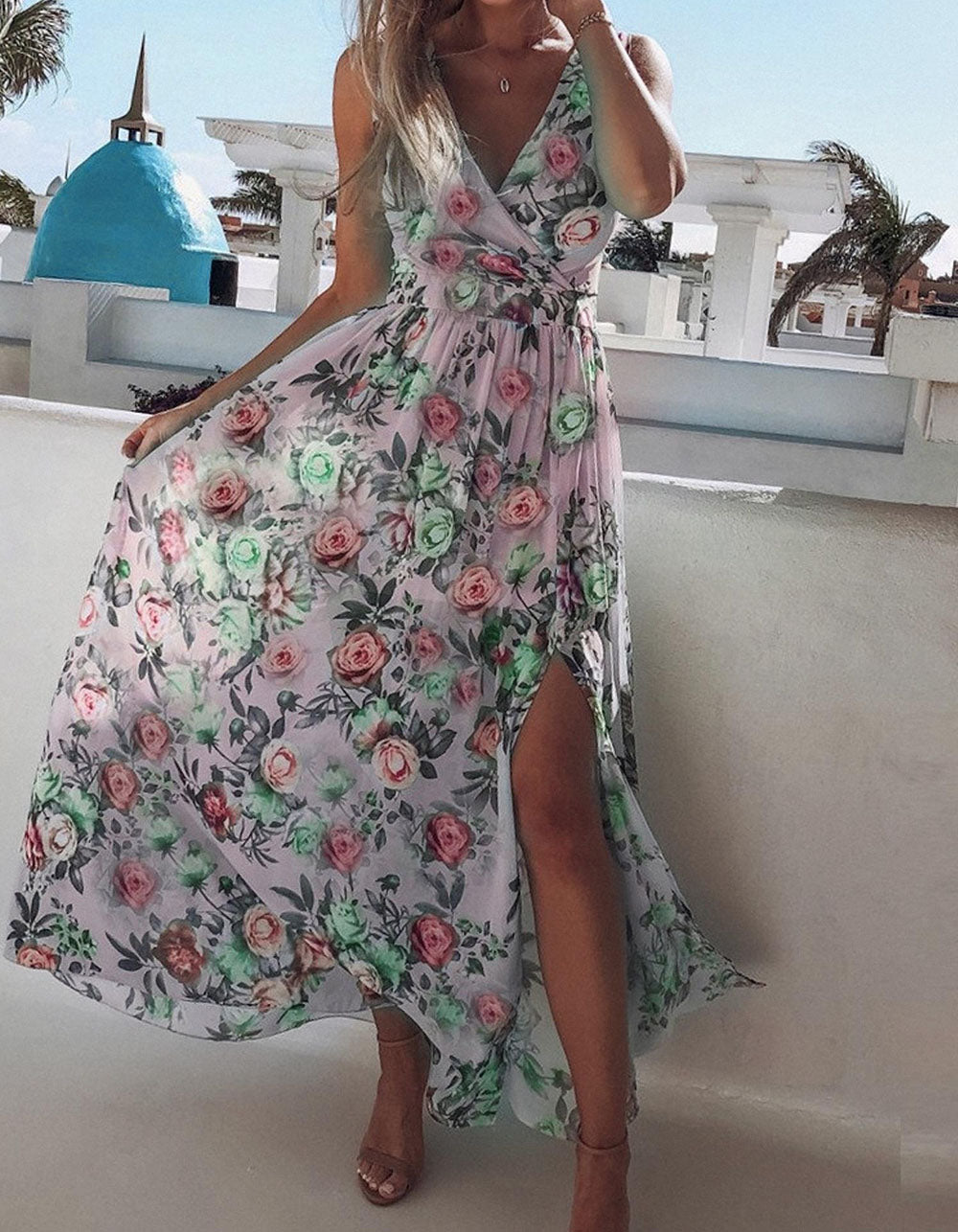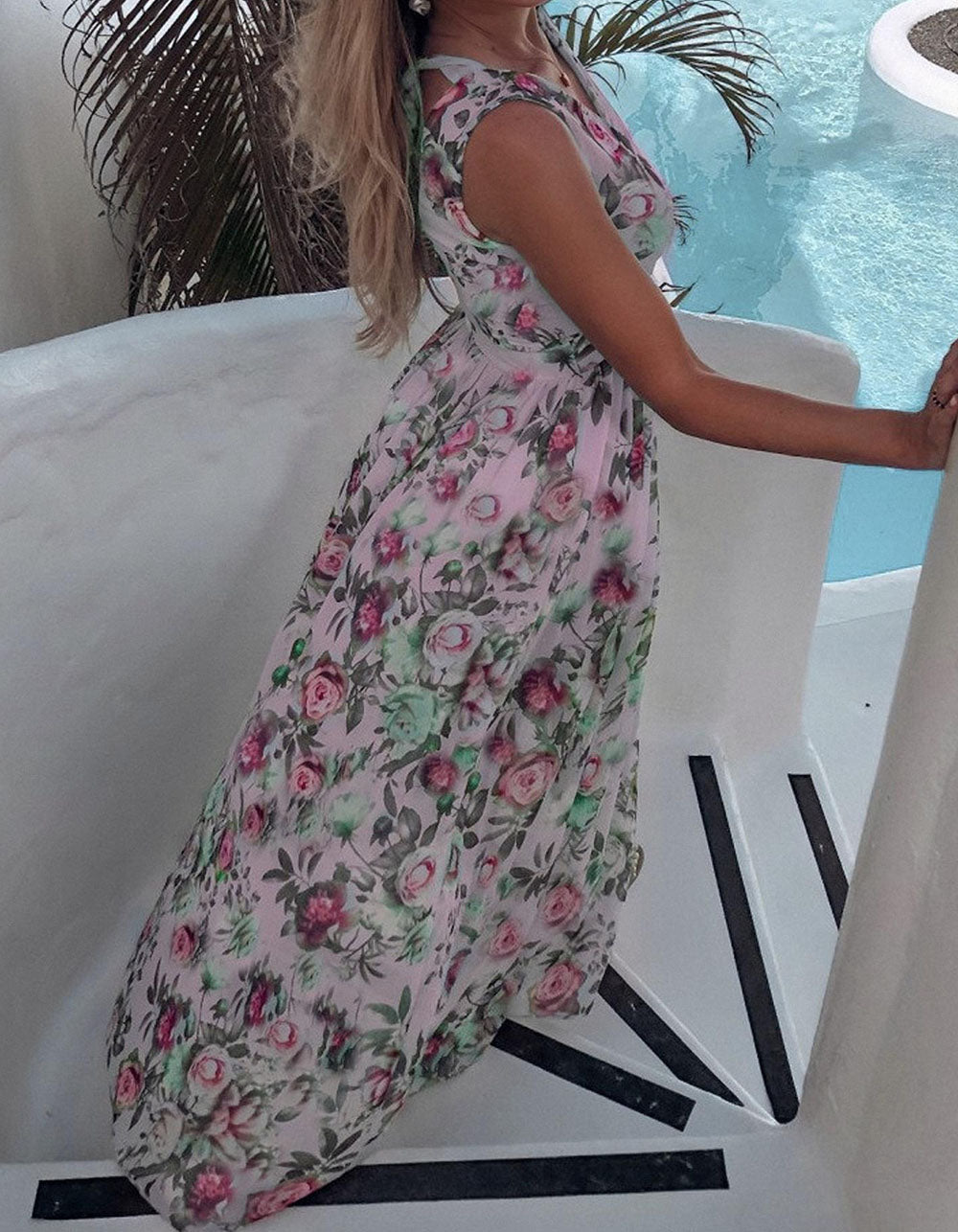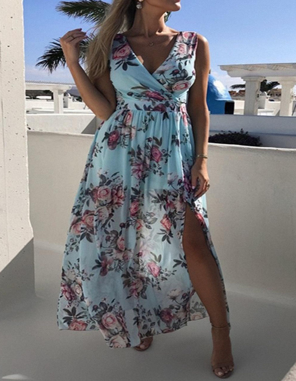 Floral Printed V Neck Sleeveless Resort Beach Split Chiffon Long Dress