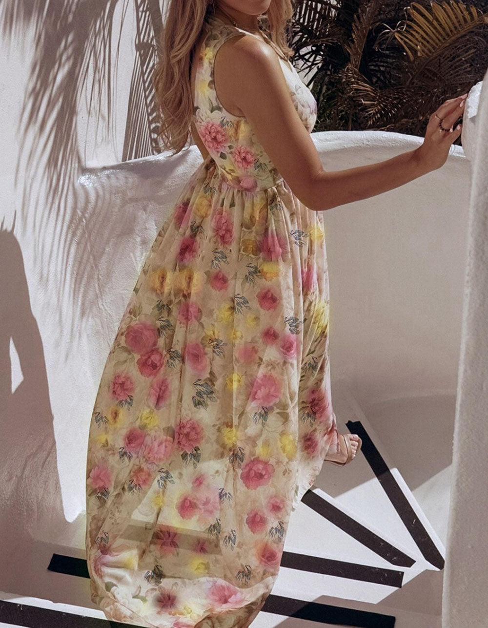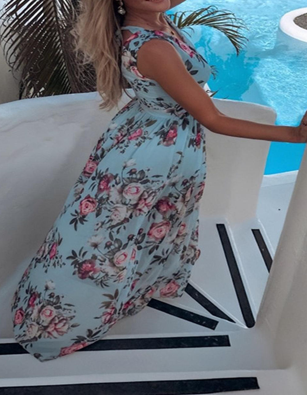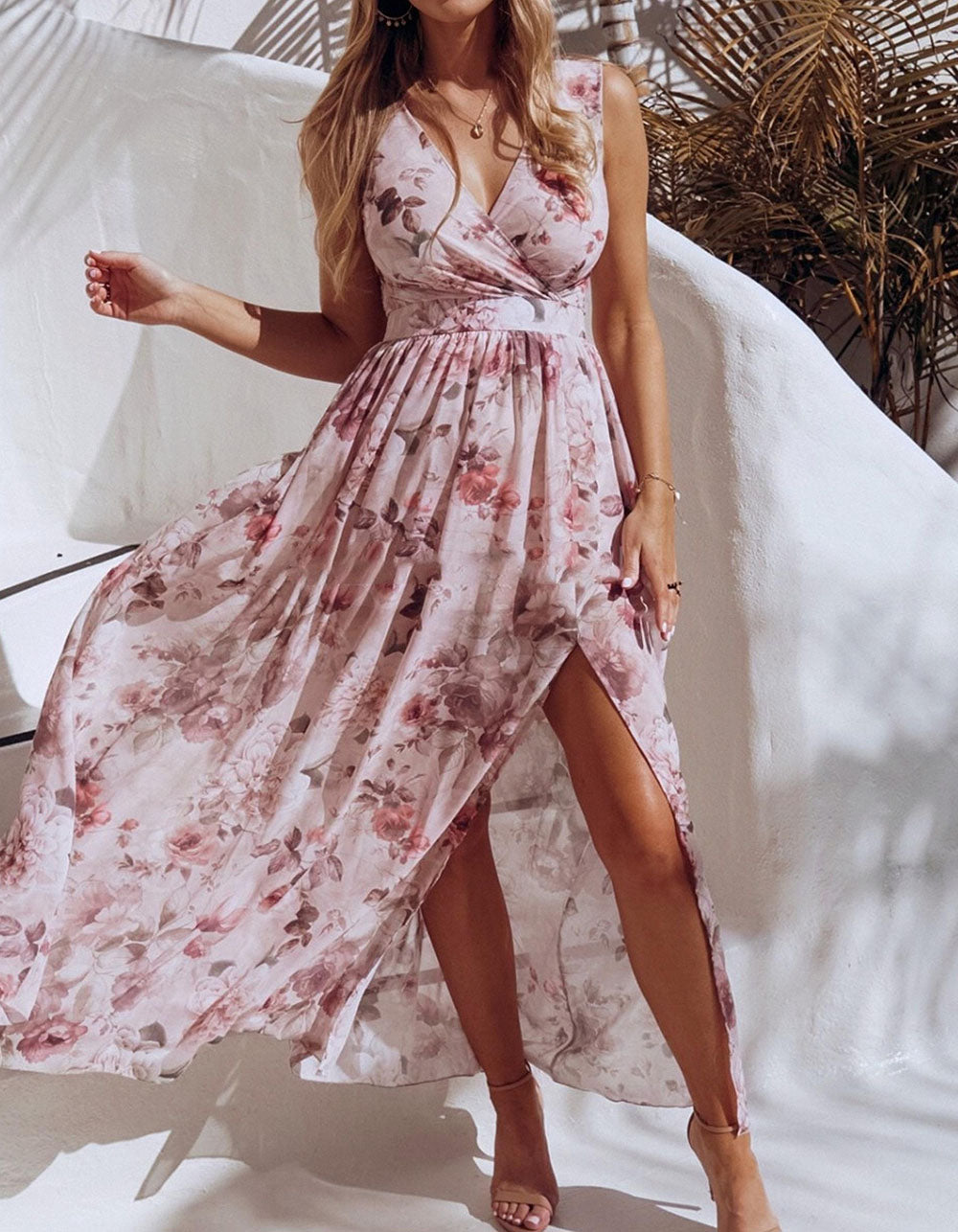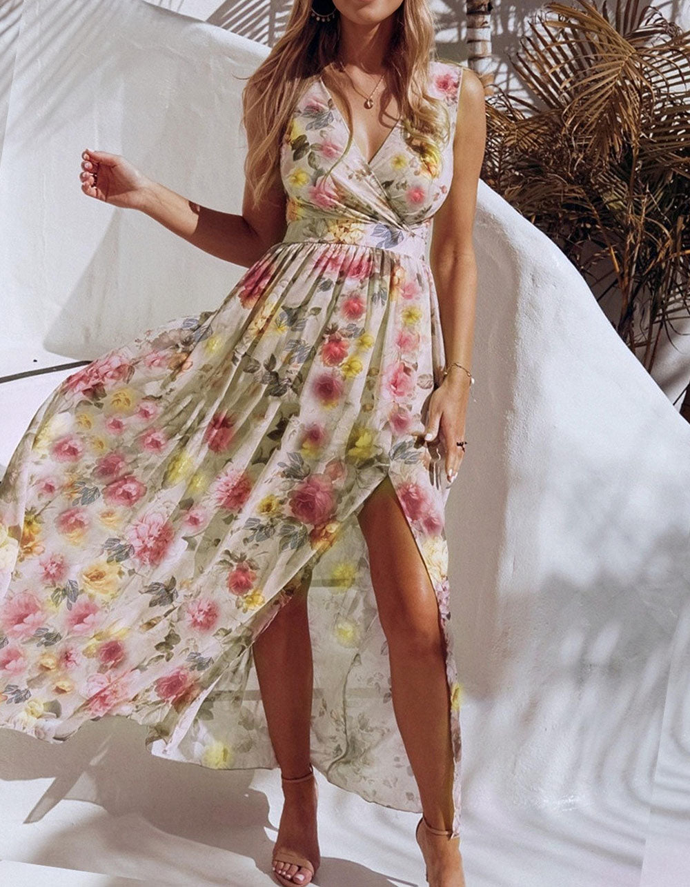 Floral Printed V Neck Sleeveless Resort Beach Split Chiffon Long Dress