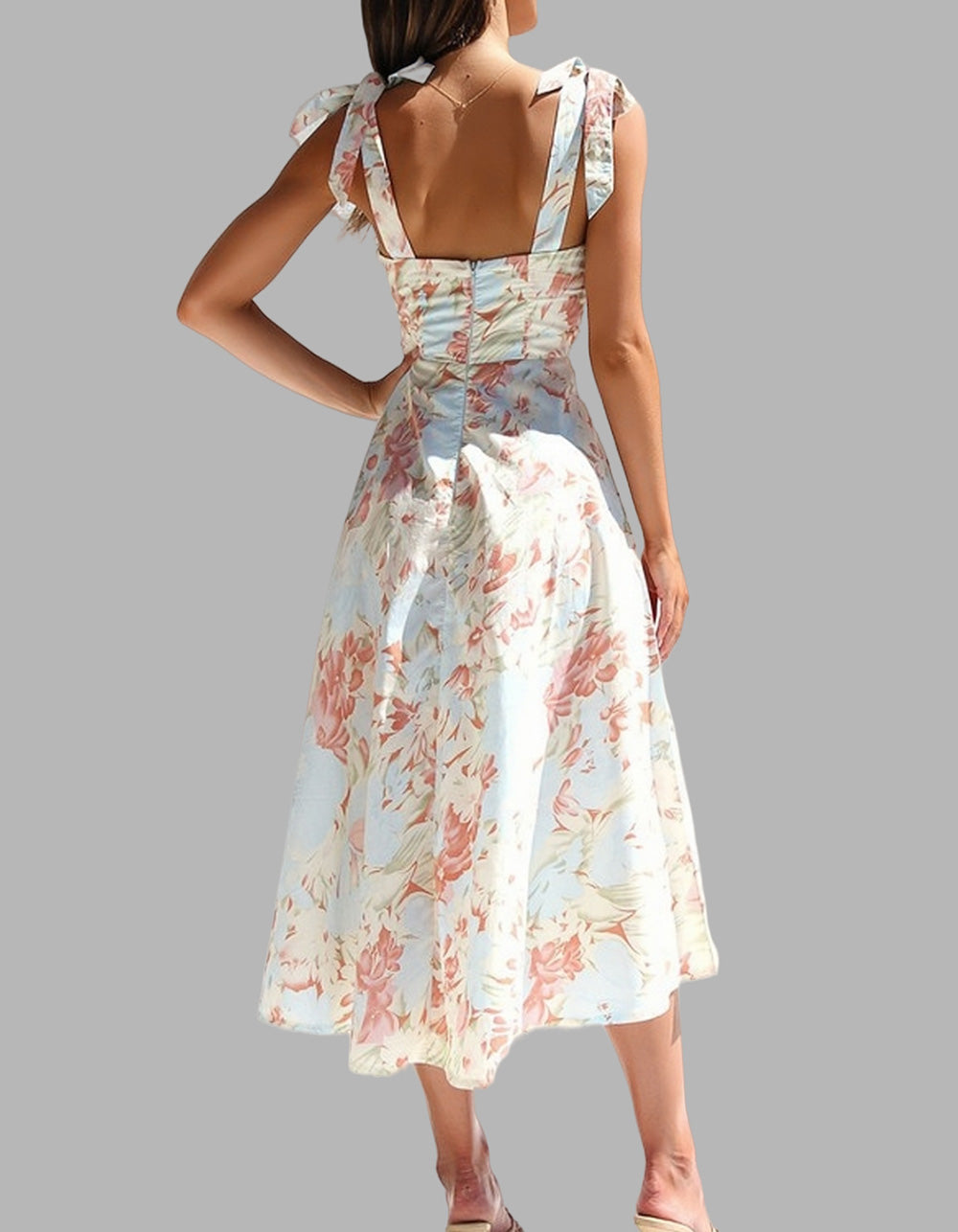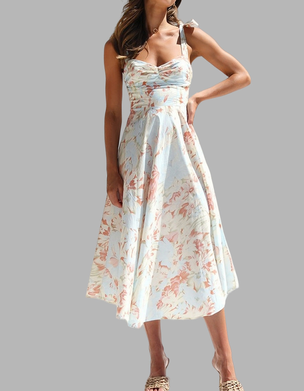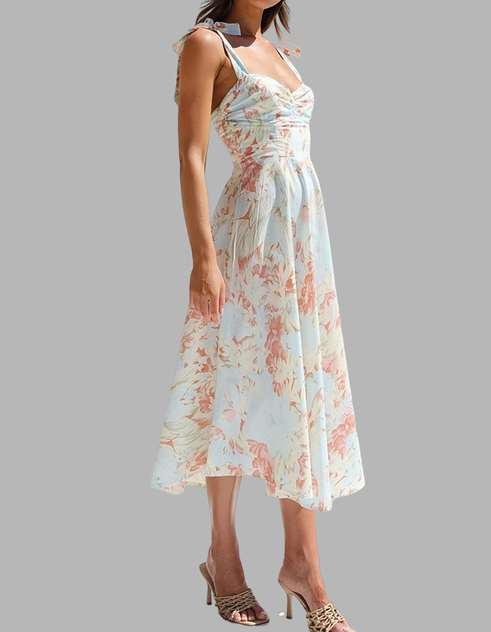 Floral Printed V-Neck Strap Mid-Length A-Line Dresses