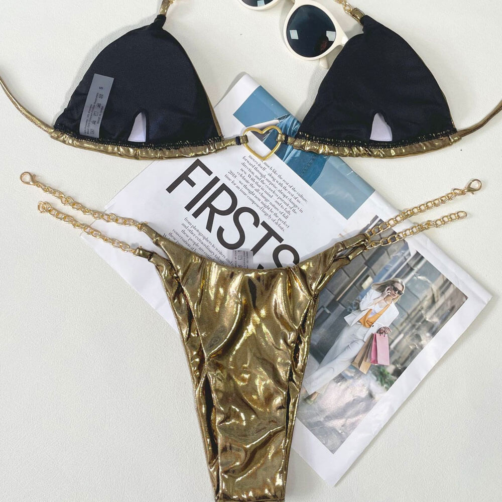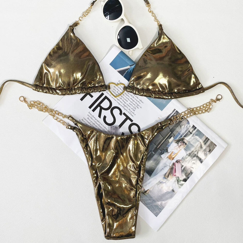 Glossy Metallic Chain Slide Triangle Brazilian Two Piece Bikini Swimsuit