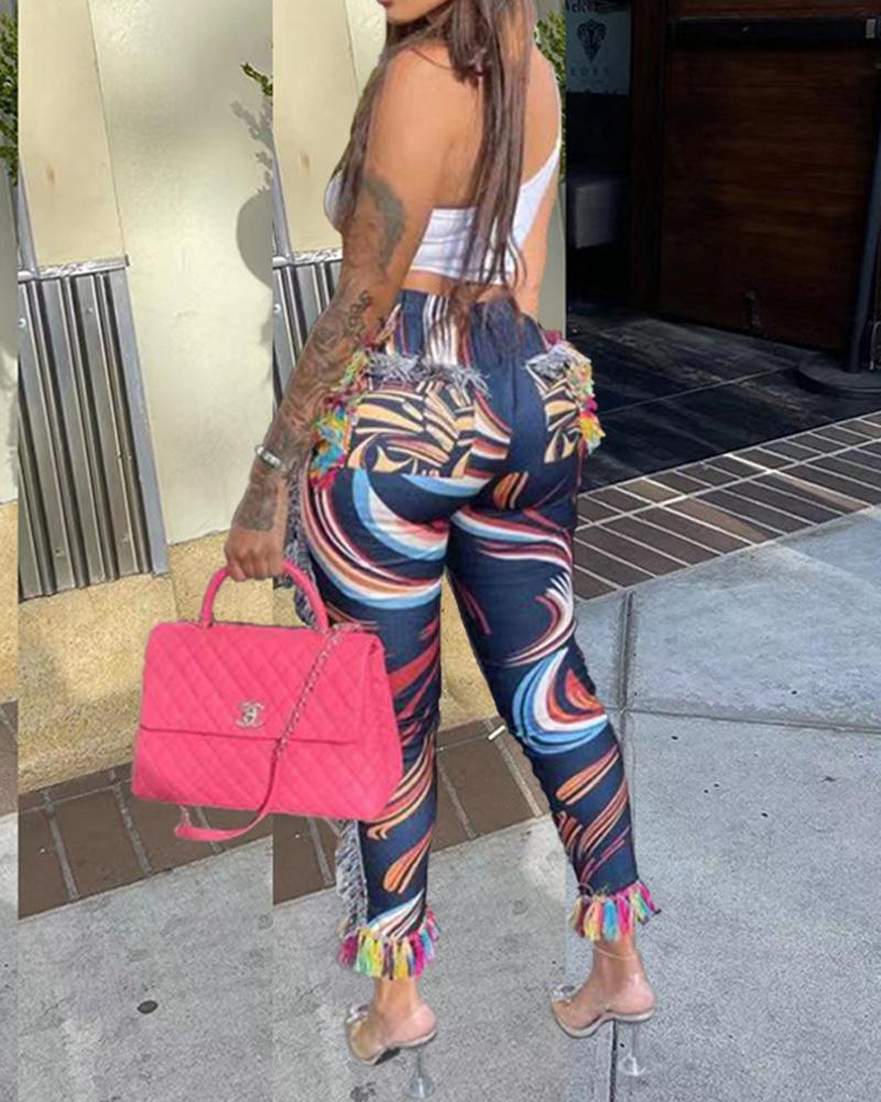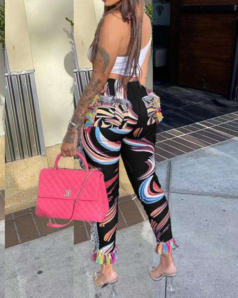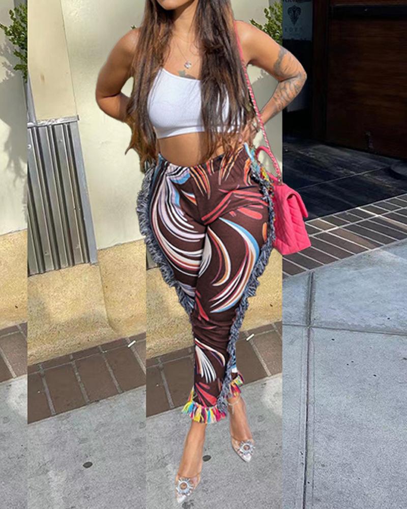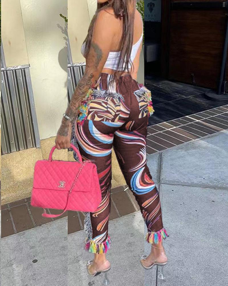 Graphic Print Fringe Trim One Shoulder Top & Pants Set