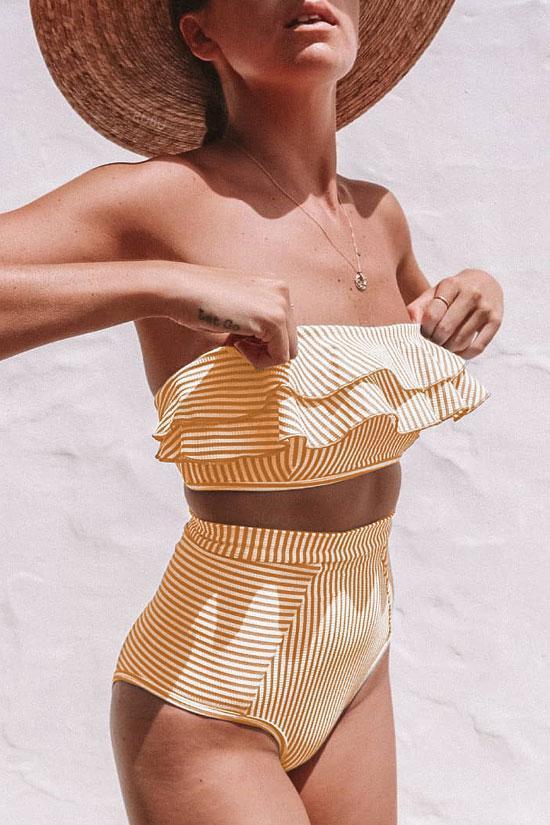 High Waisted Striped Ruffle Bandeau Bikini - Two Piece Swimsuit