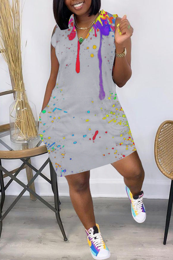 Ink Splatter Print Loose Sleeveless V-Neck Dress