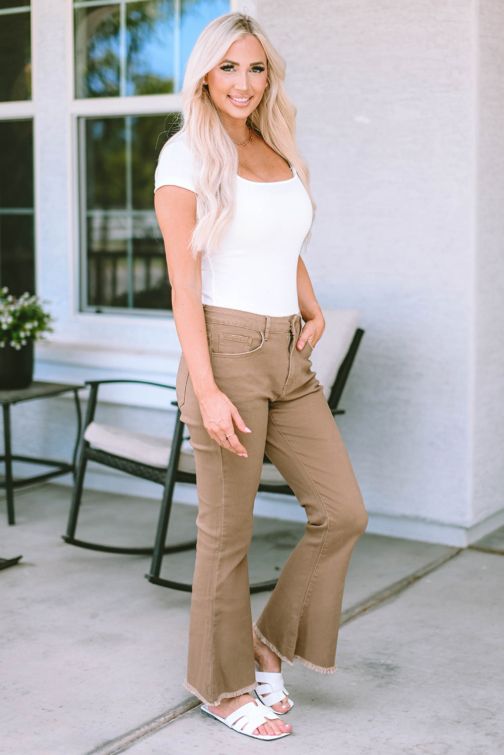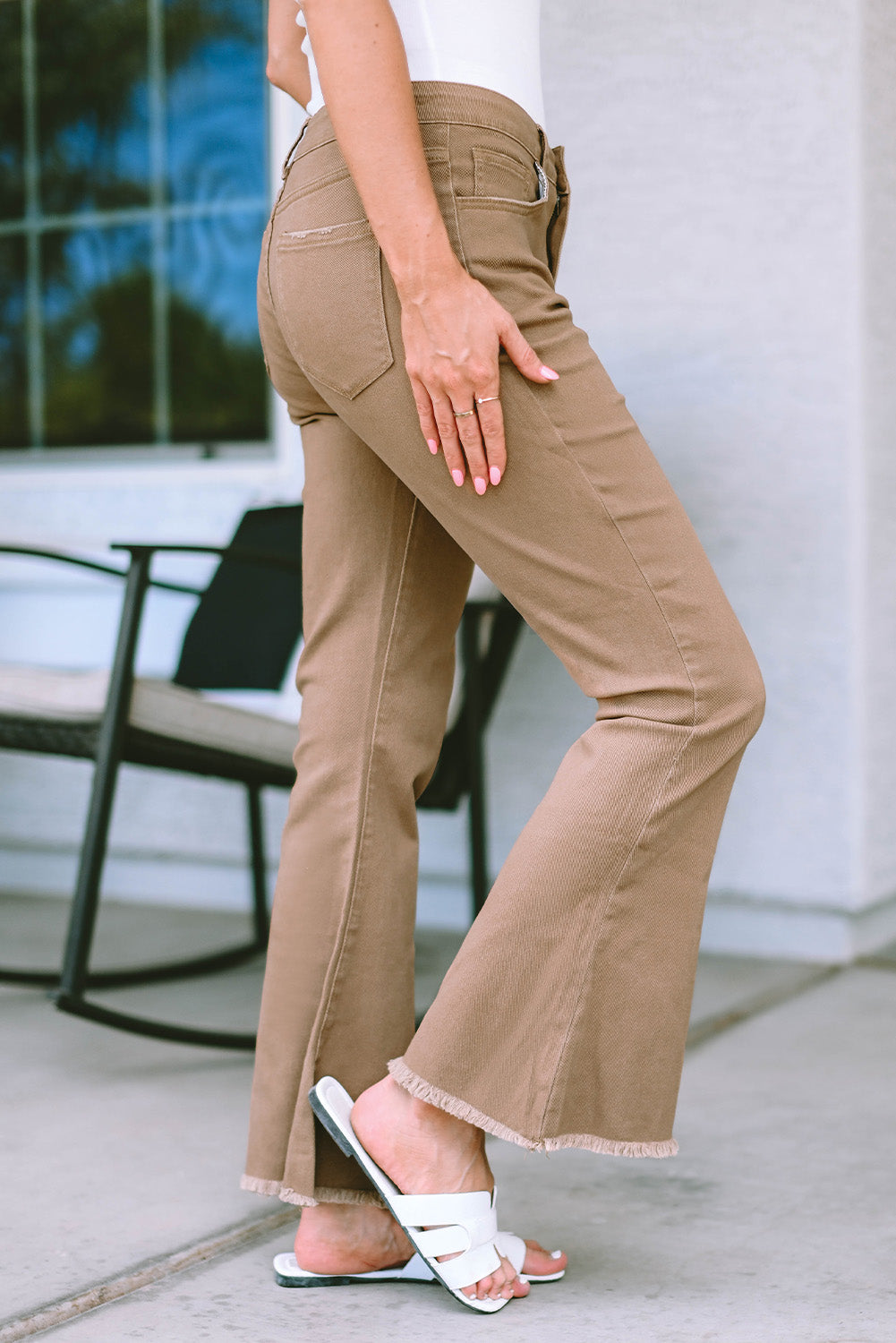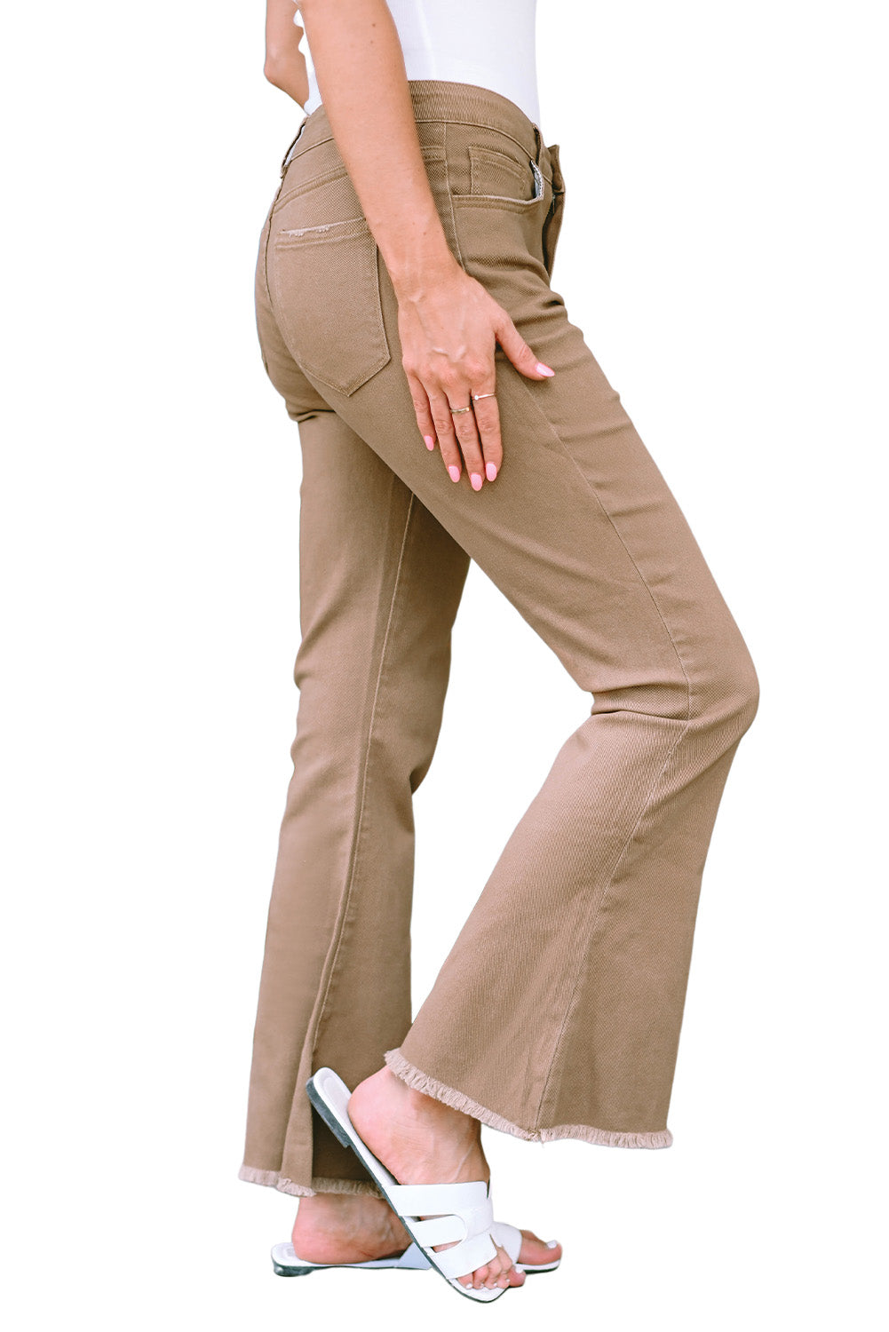 Khaki Raw Hem High Waist Flare Jeans