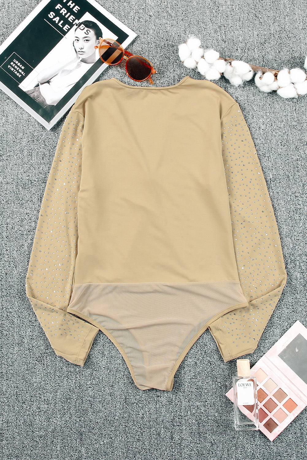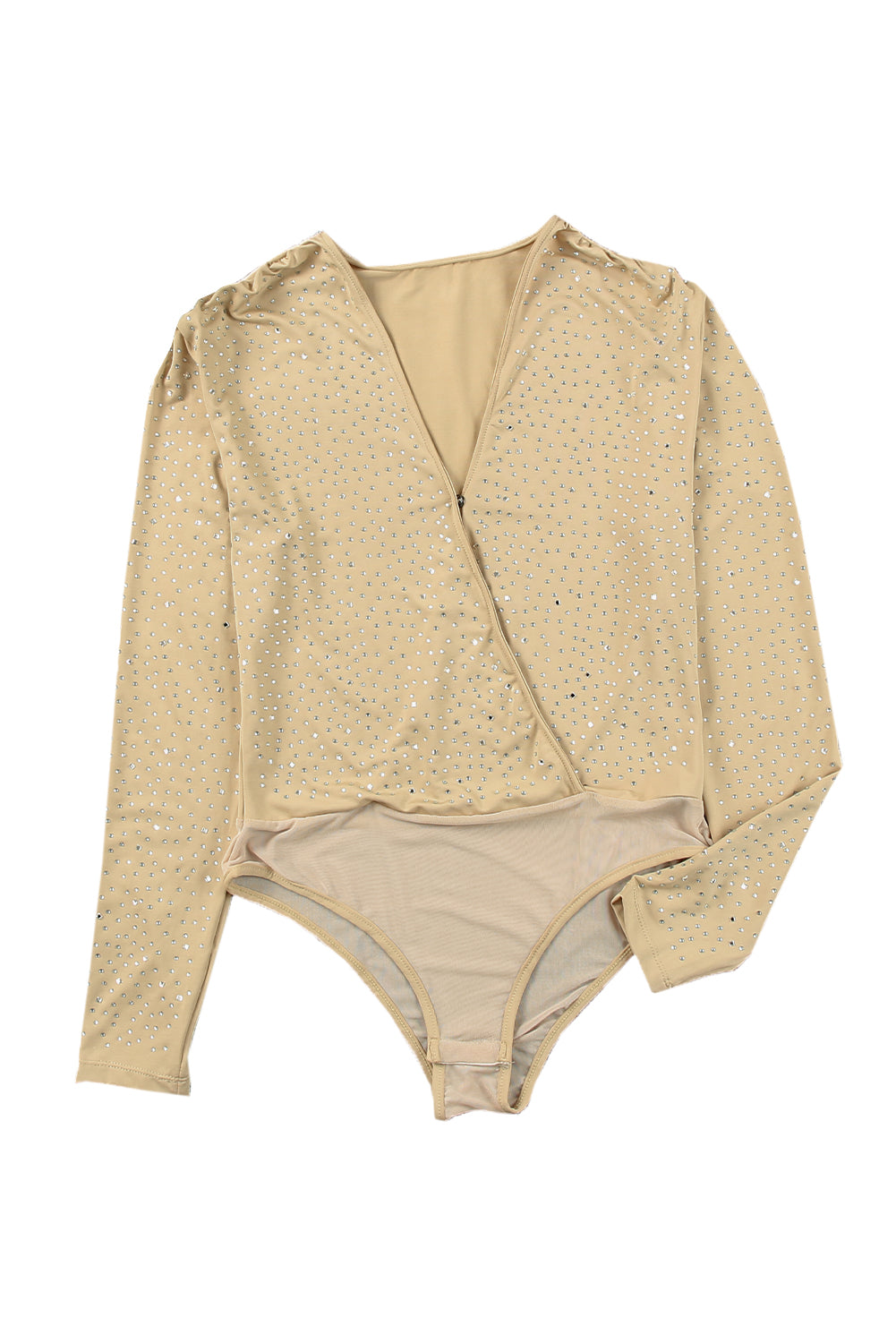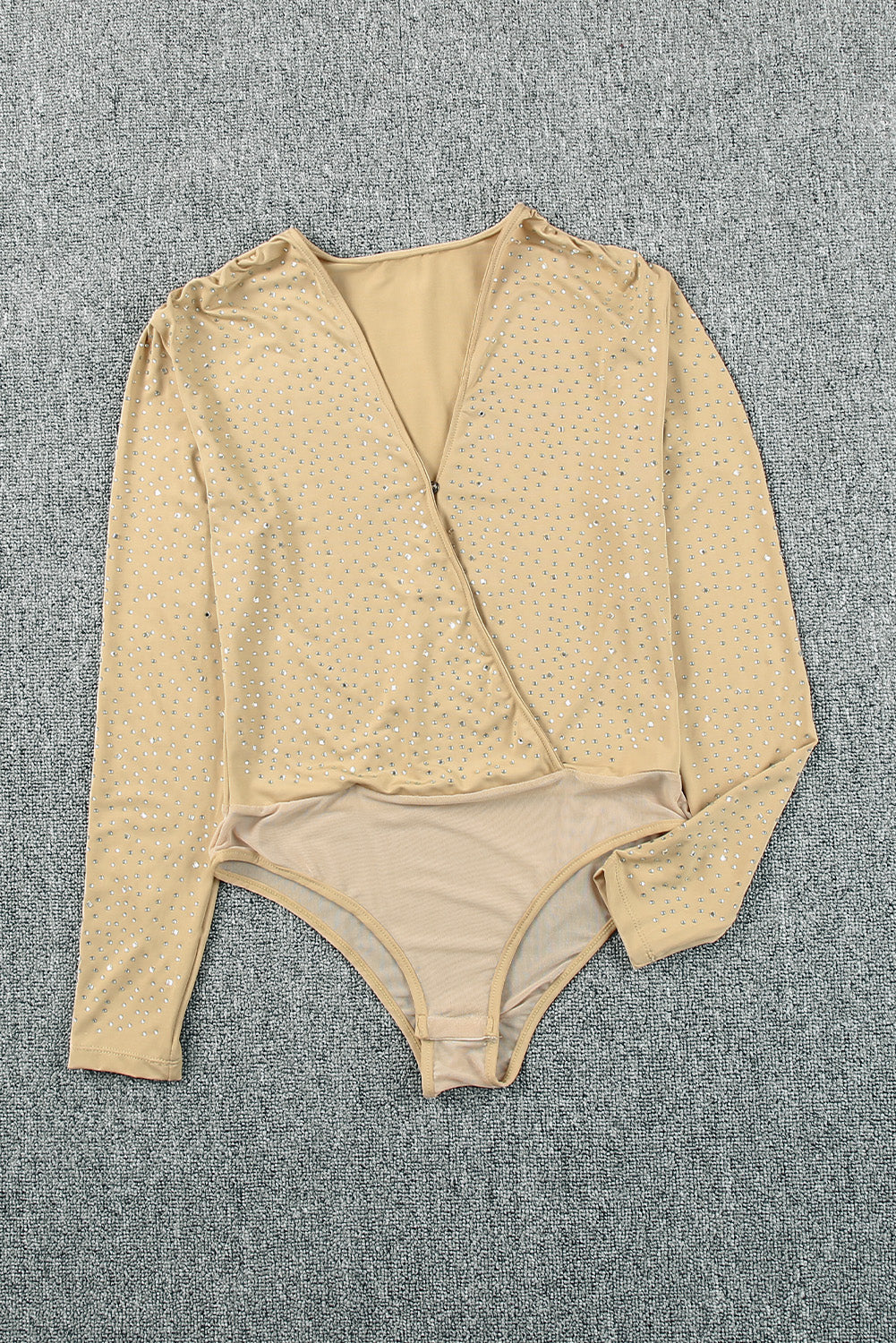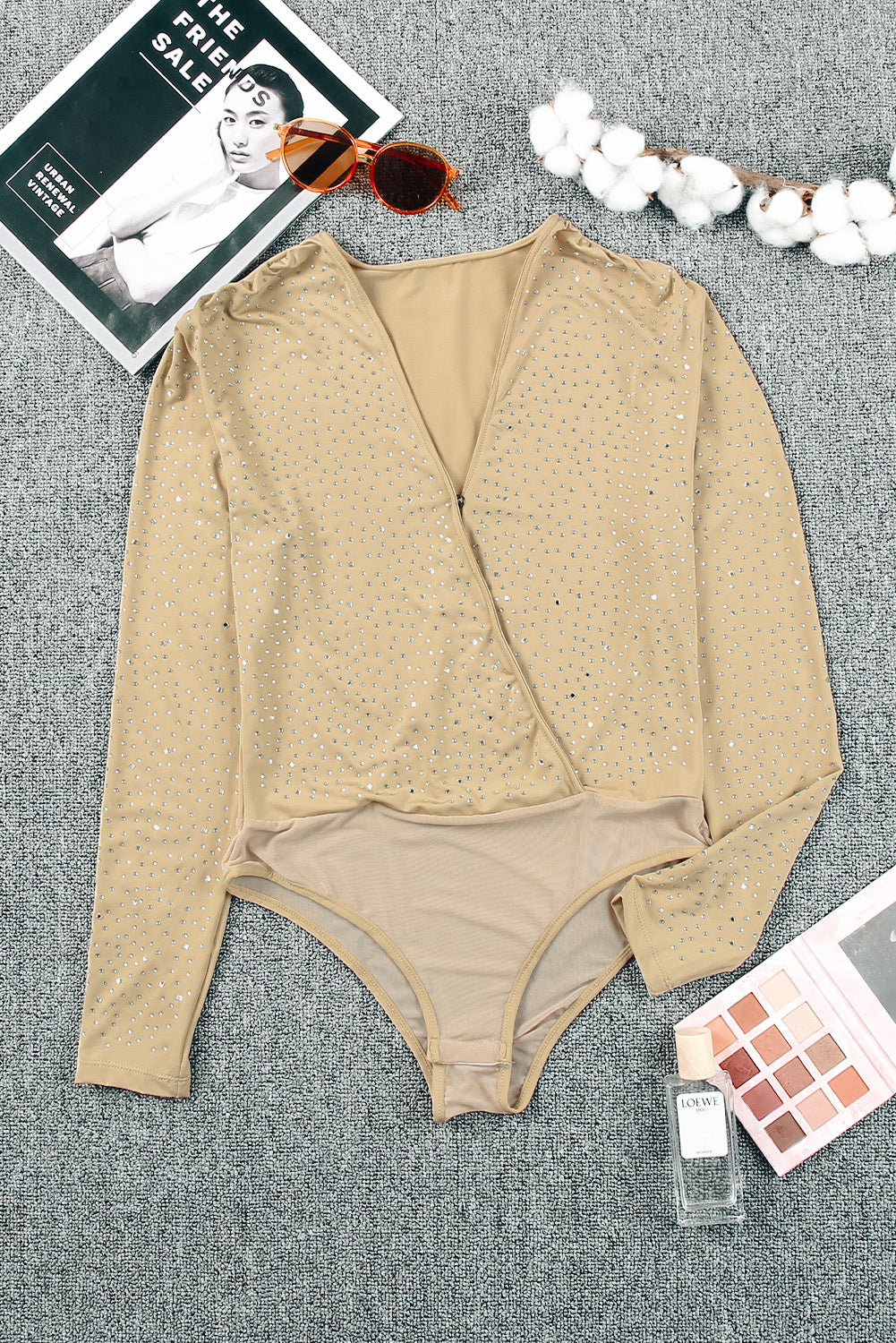 Khaki Rhinestone Surplice V Neck Long Sleeve Bodysuit