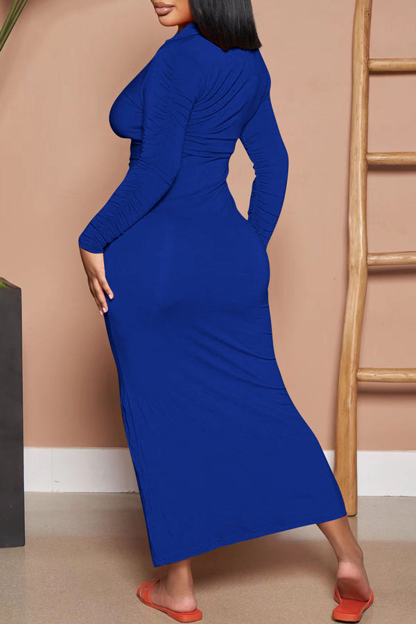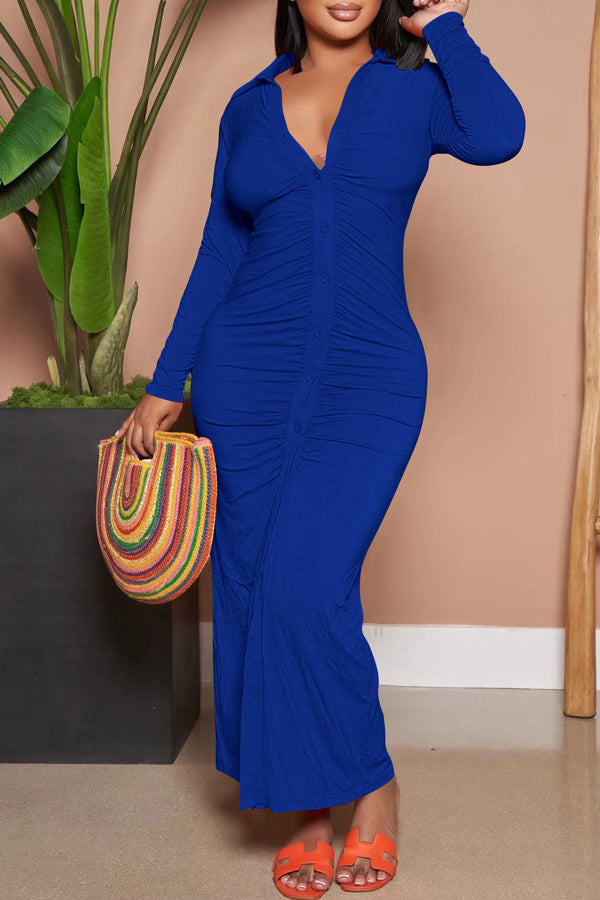 Lapel Single-Breasted Crinkled Slim Fit Long Sleeve Maxi Dress