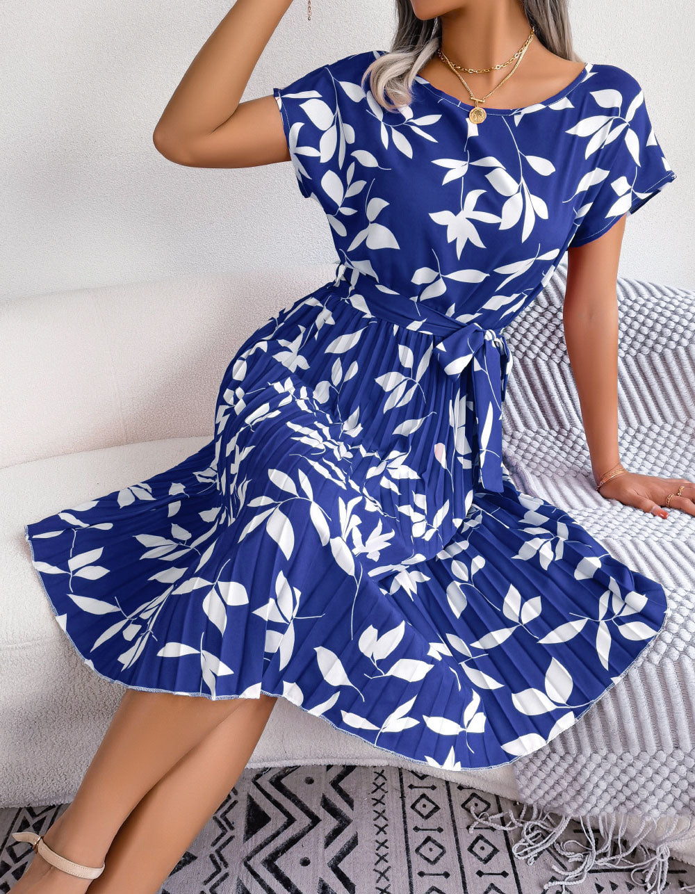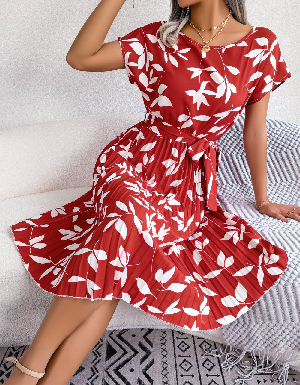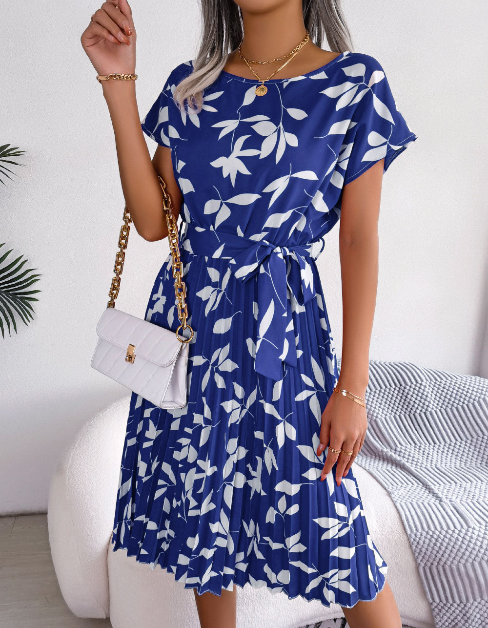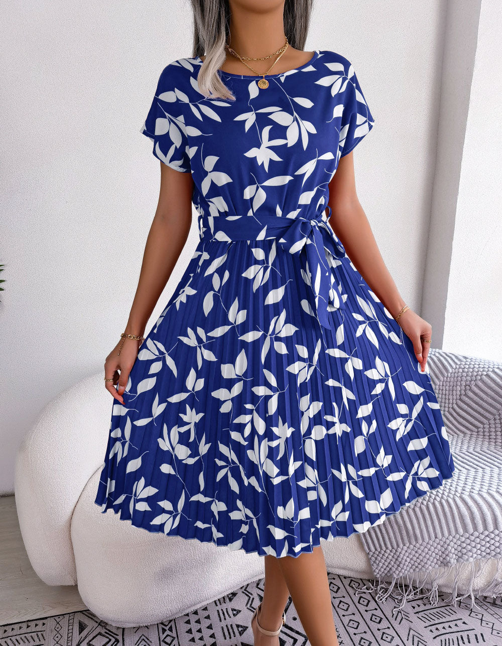Leaf Print Round Neck Short Sleeve Midi A-Line Dresses