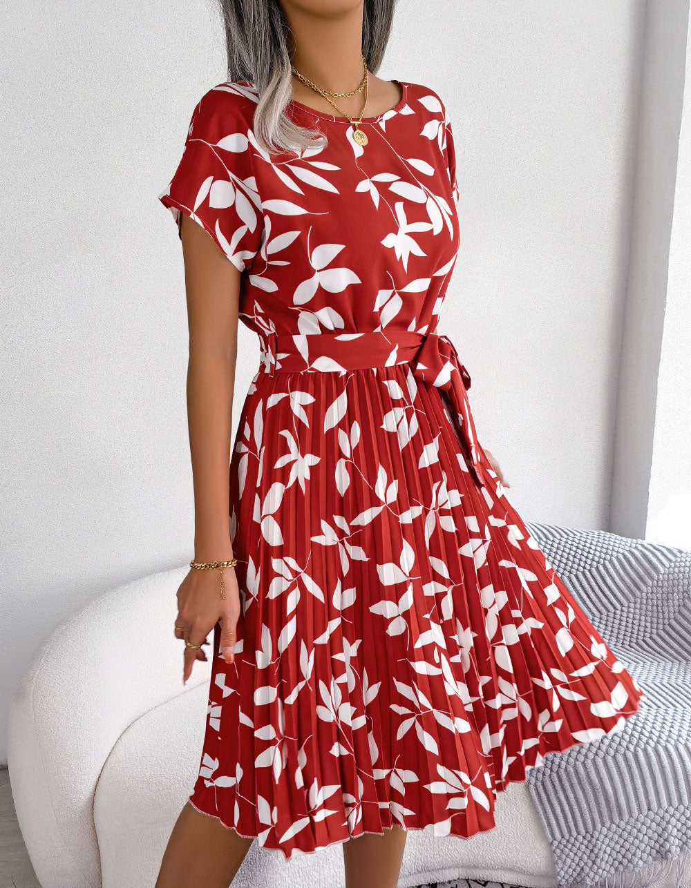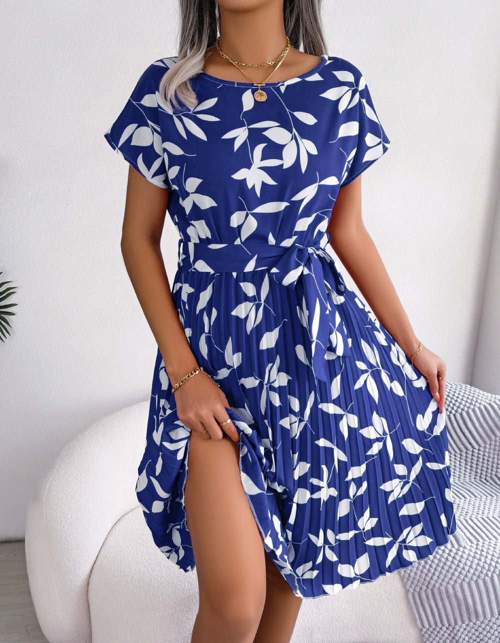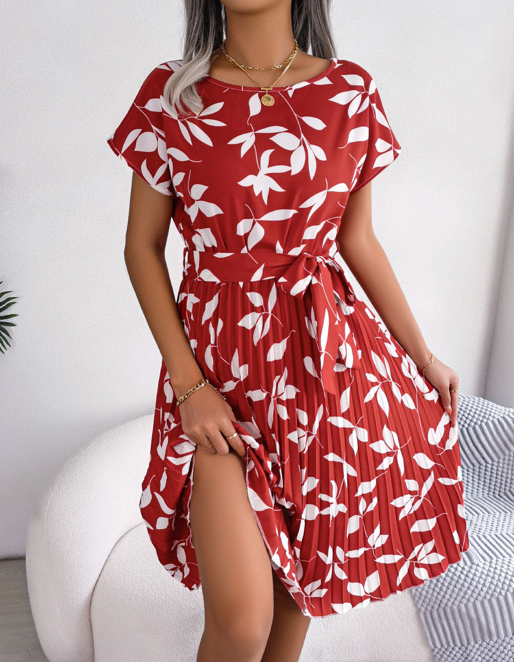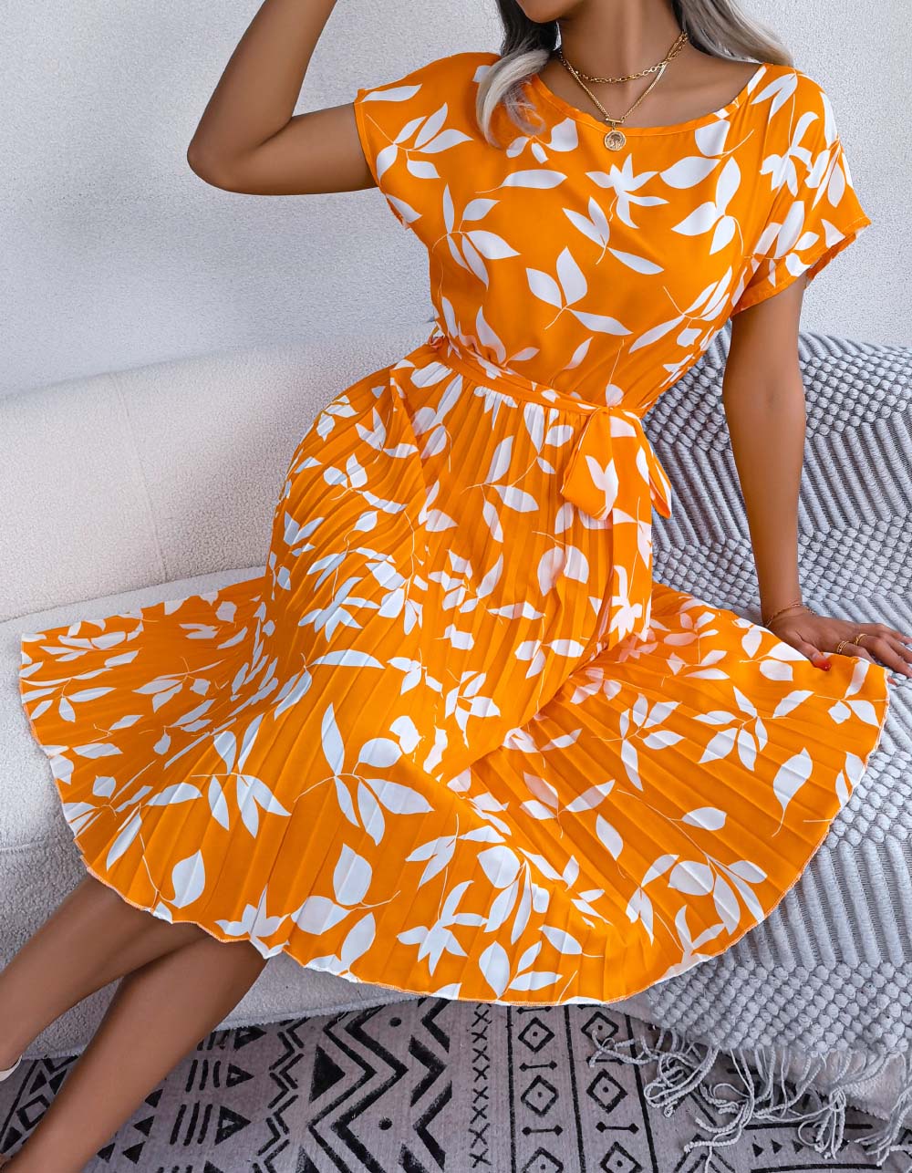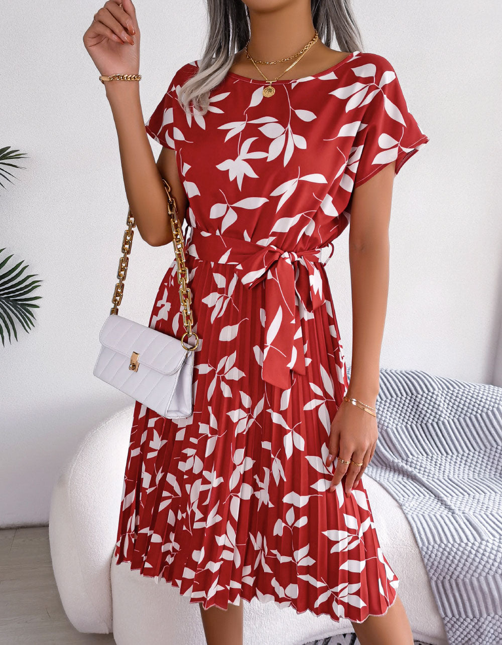 Leaf Print Round Neck Short Sleeve Midi A-Line Dresses
