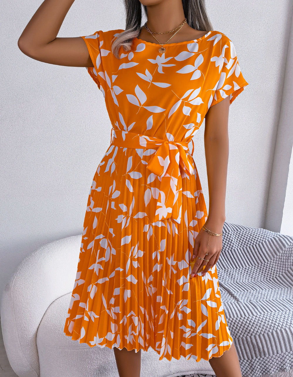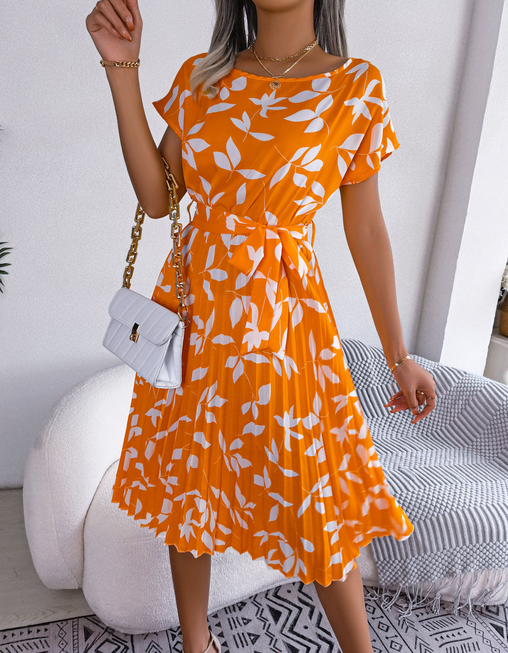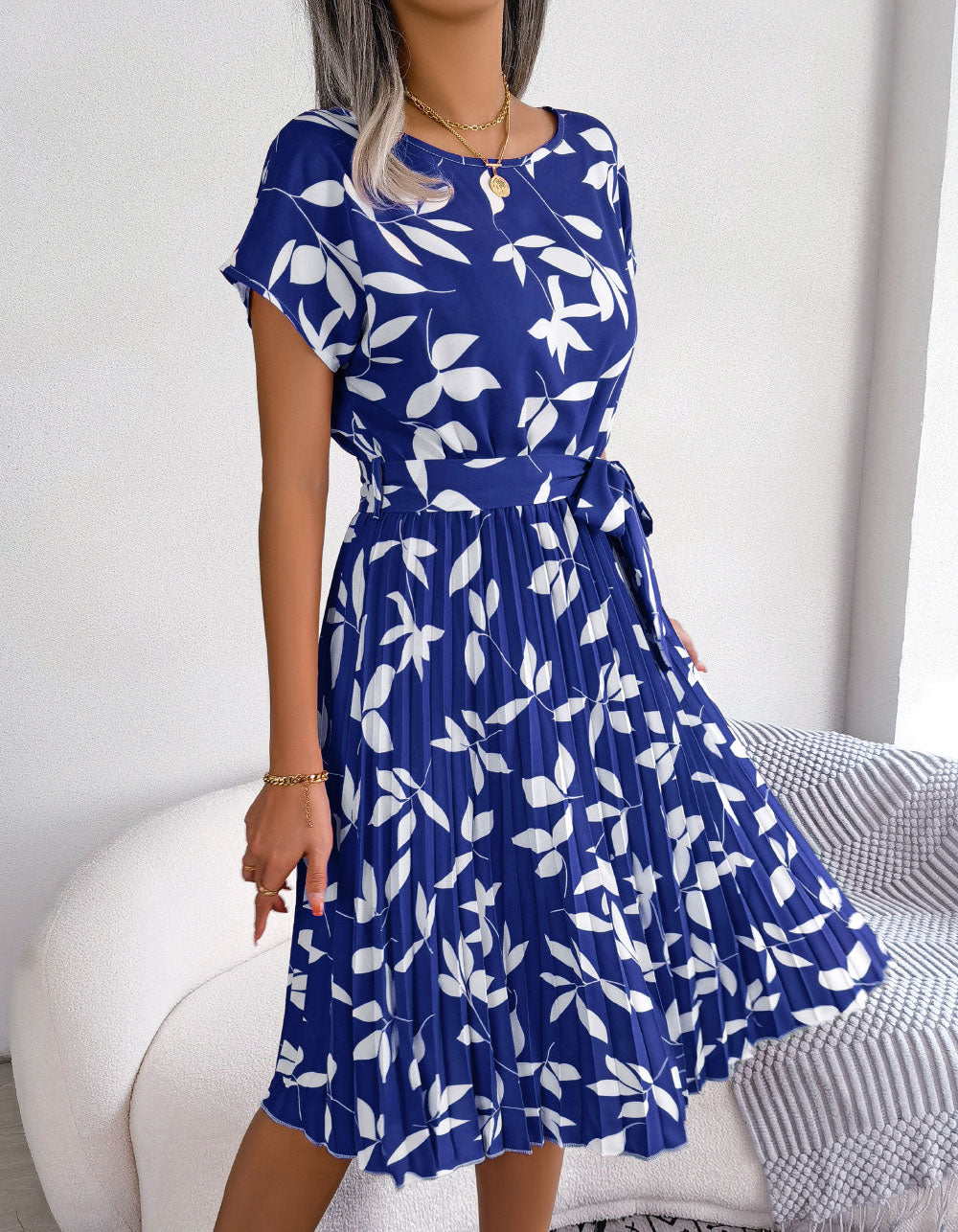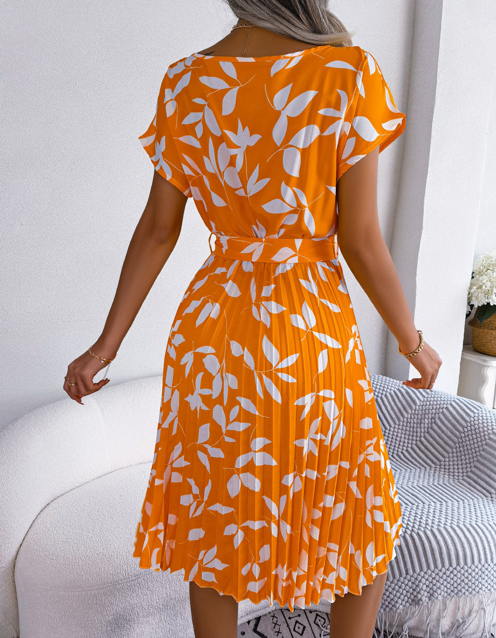 Leaf Print Round Neck Short Sleeve Midi A-Line Dresses