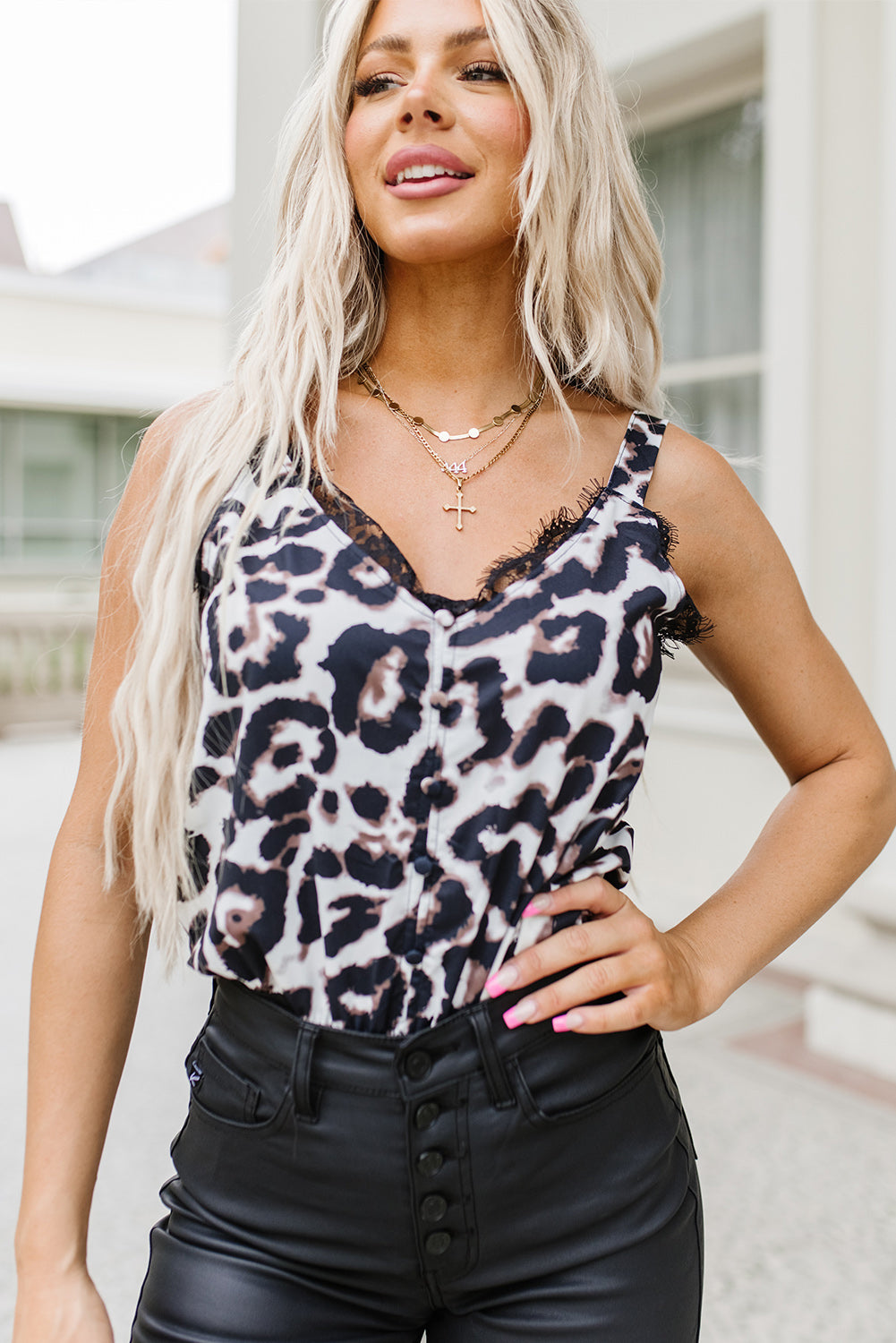 Leopard Eyelash Lace Trim Adjustable Shoulder Straps Bodysuit
