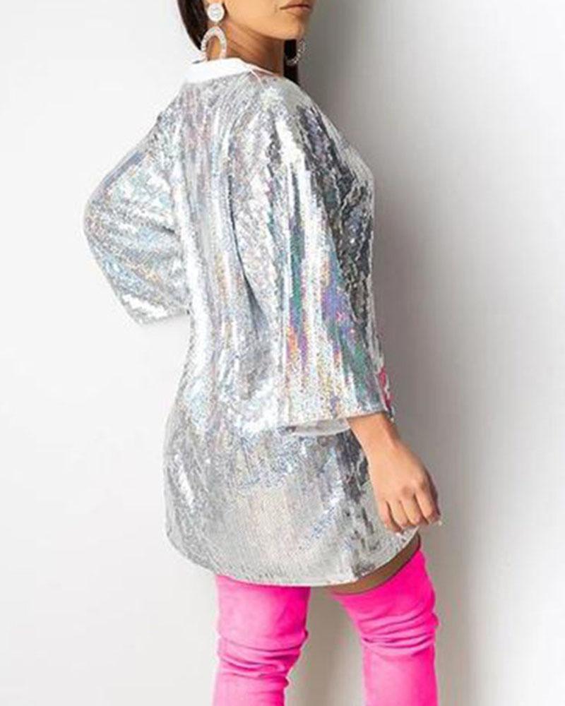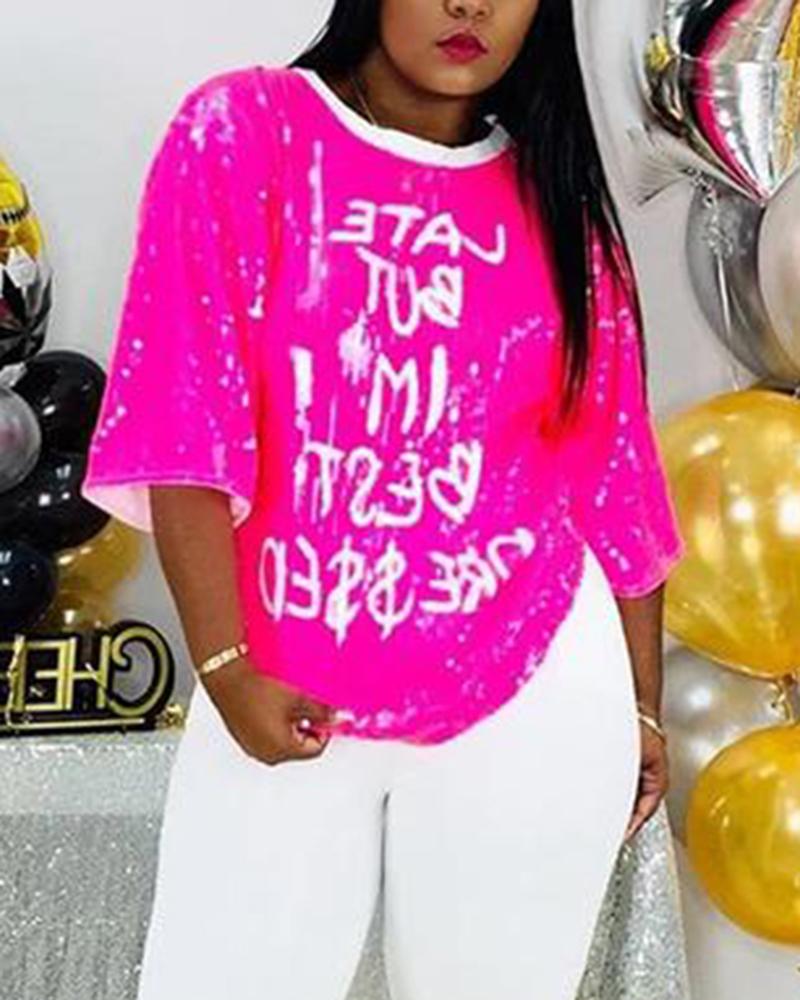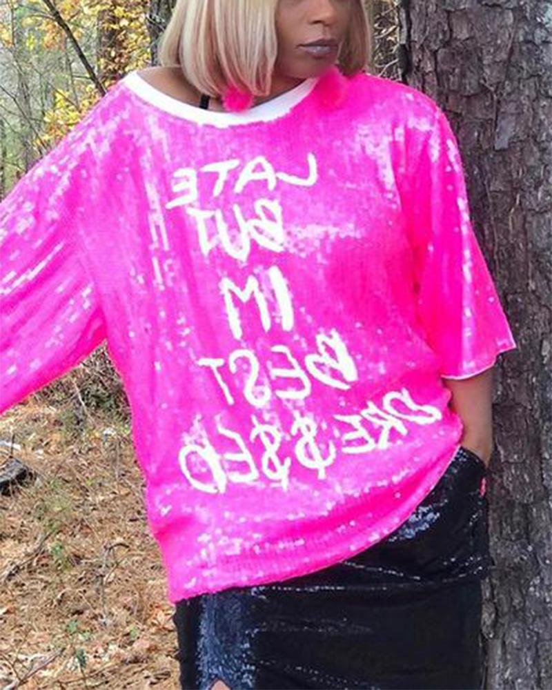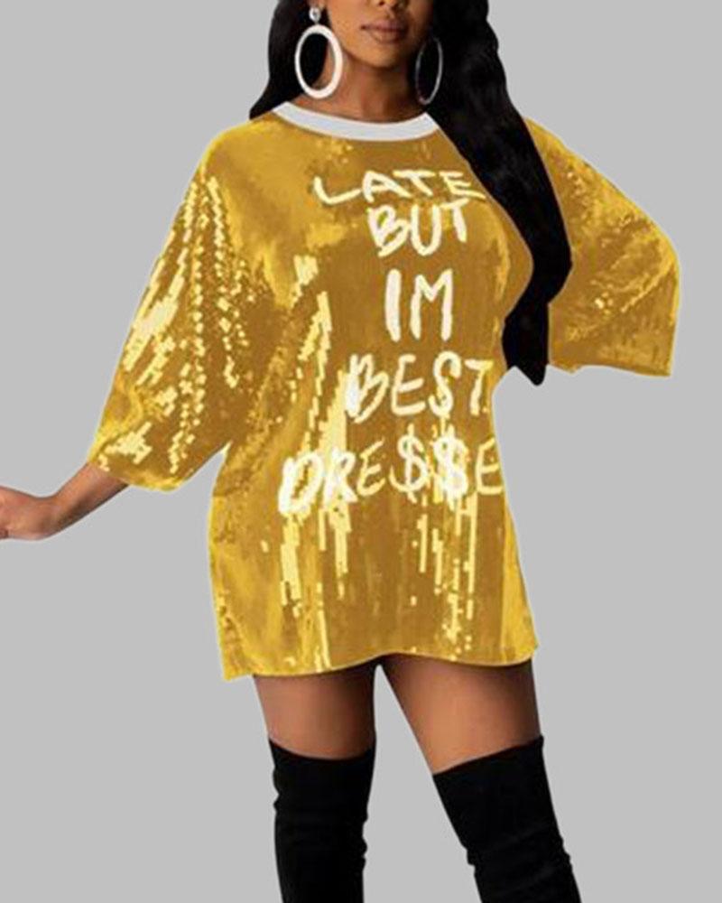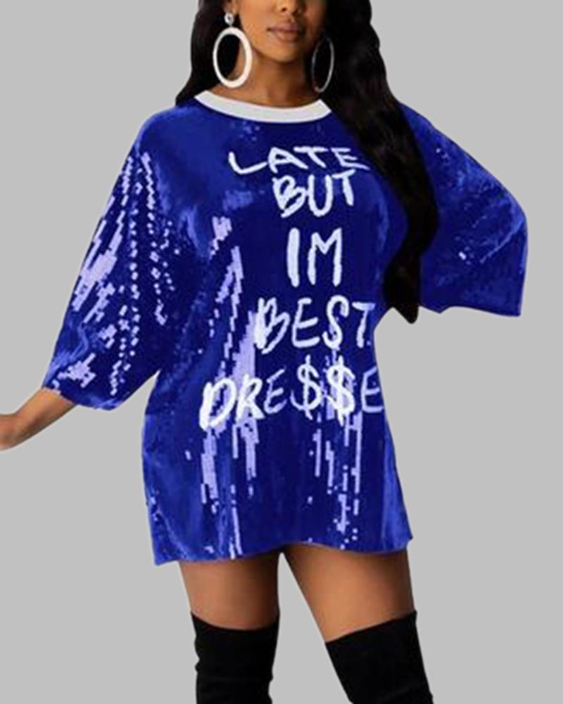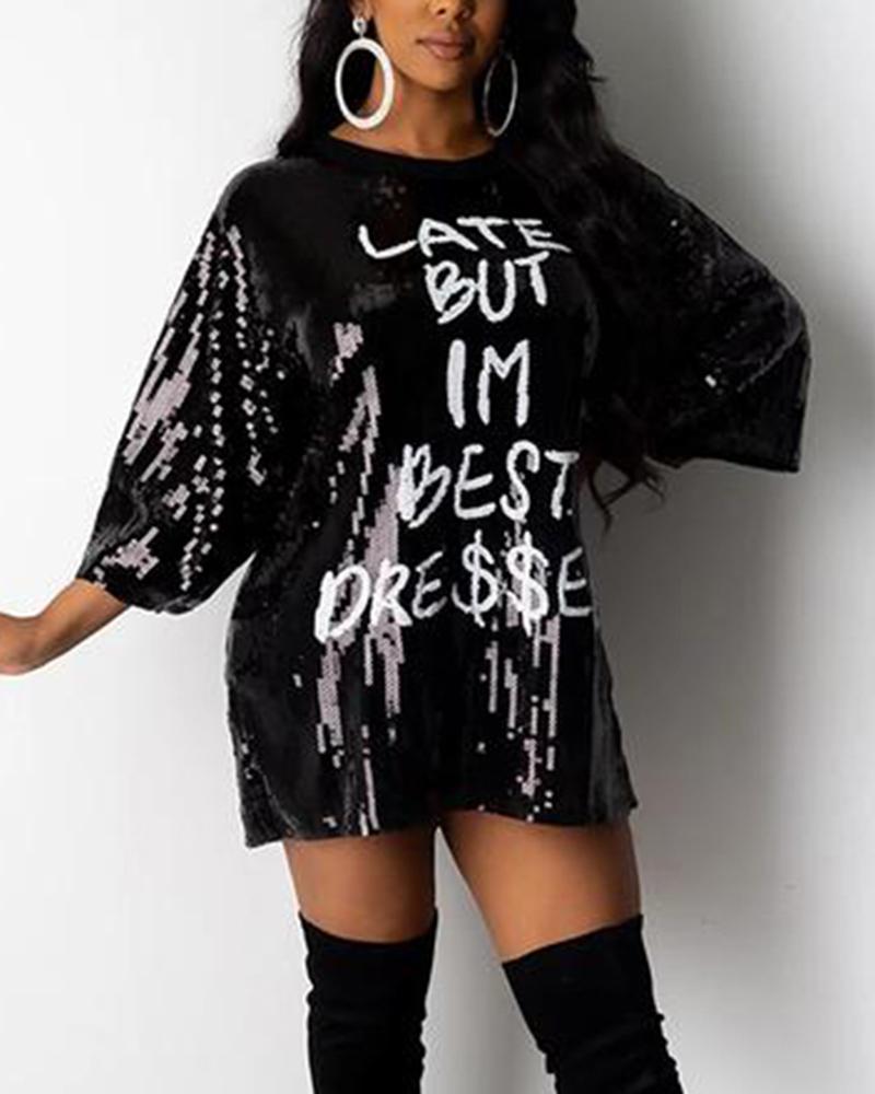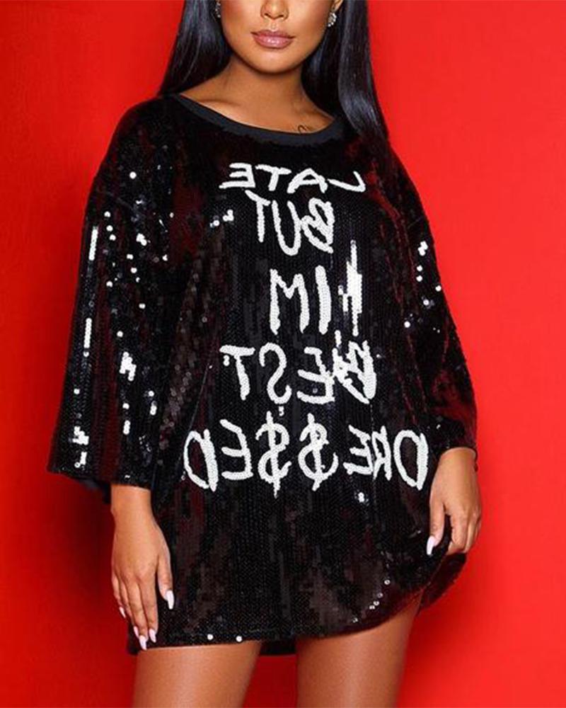 Letter Print Sequins Decor Round Neck Mini Dress