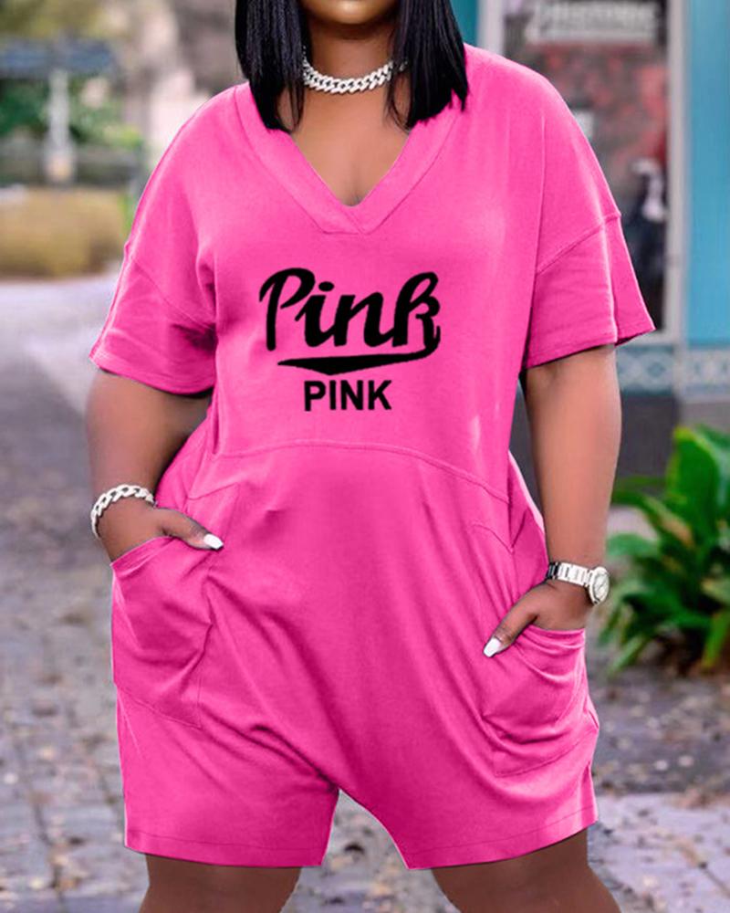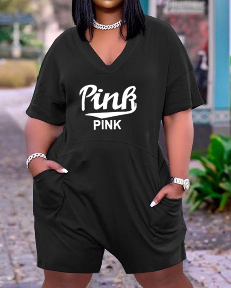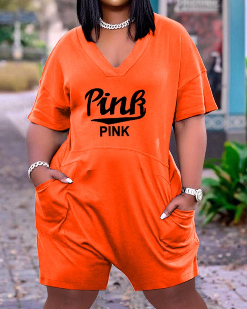 Letter Print Slant Pocket Zip Back Casual Romper