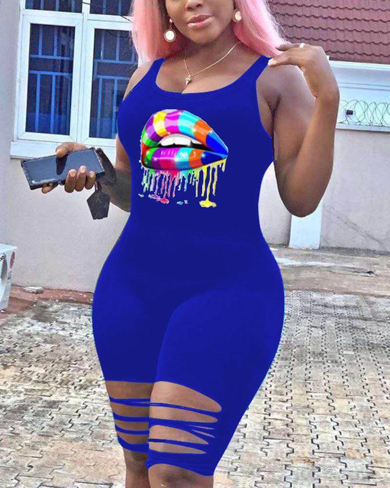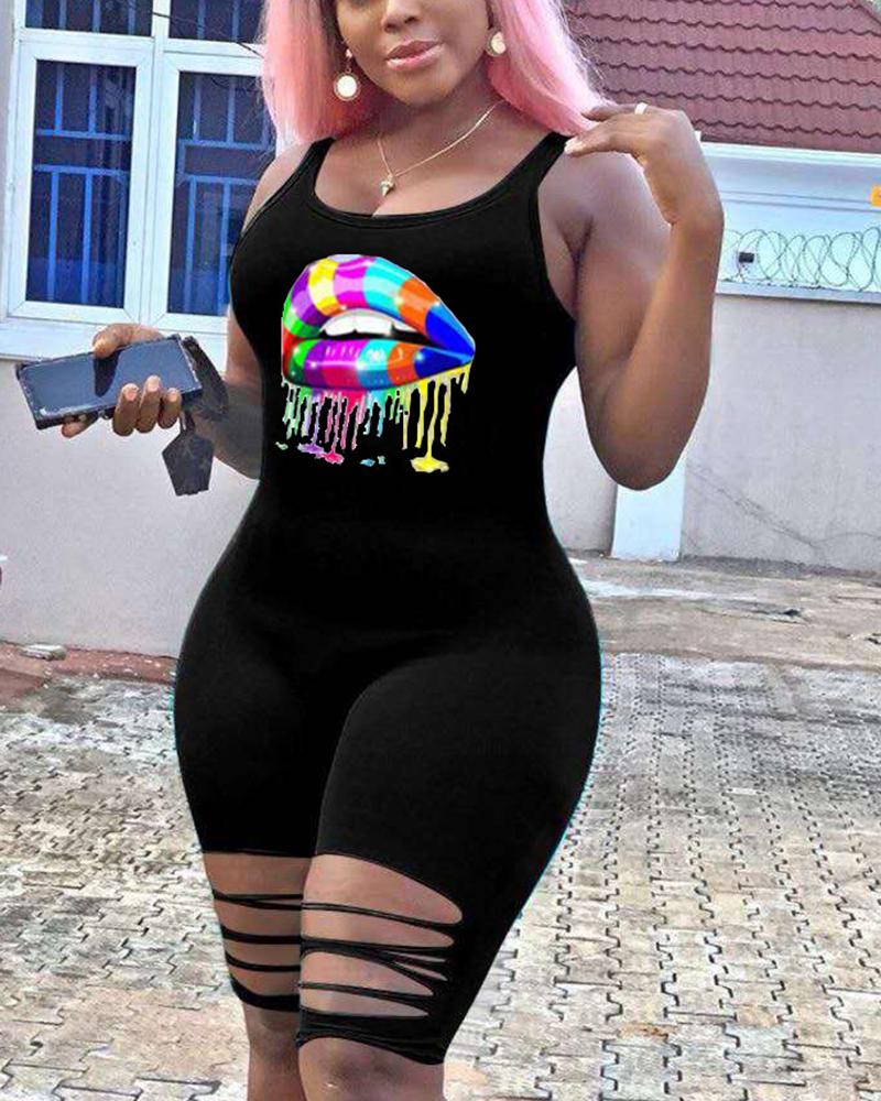 Lip Print Cut Out Backless Cami Casual Romper