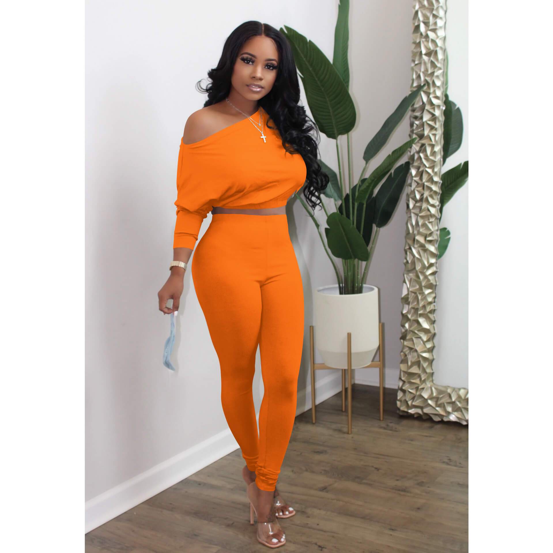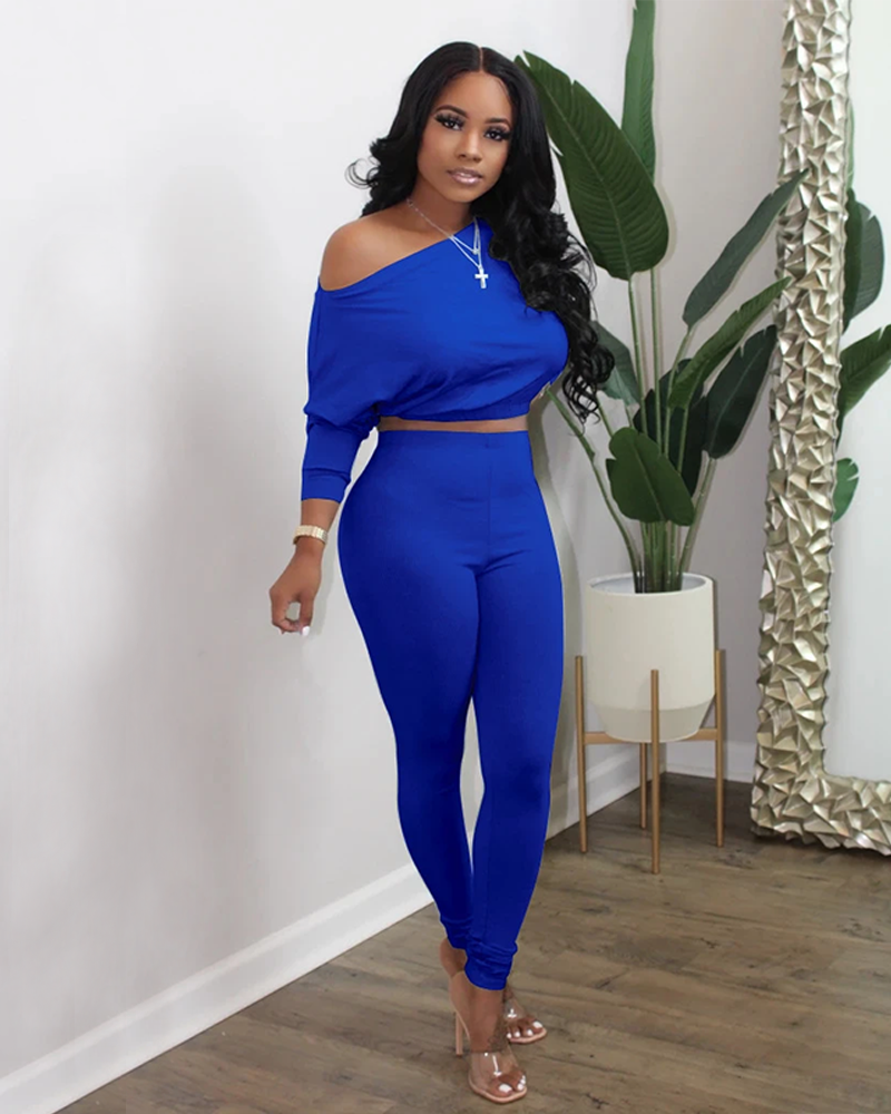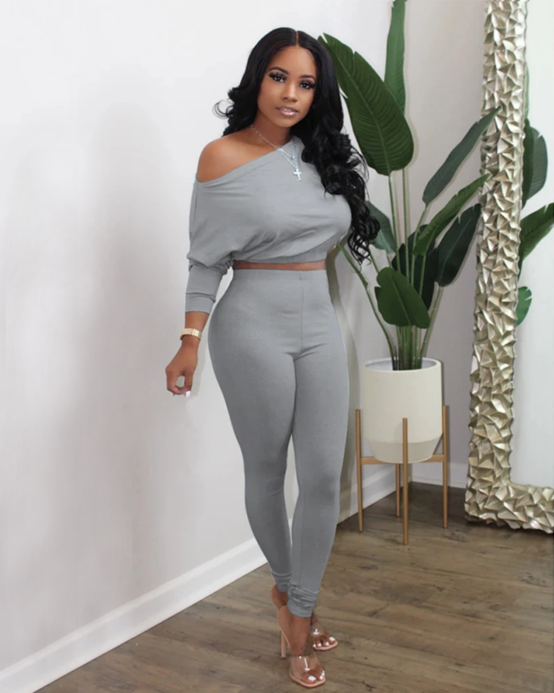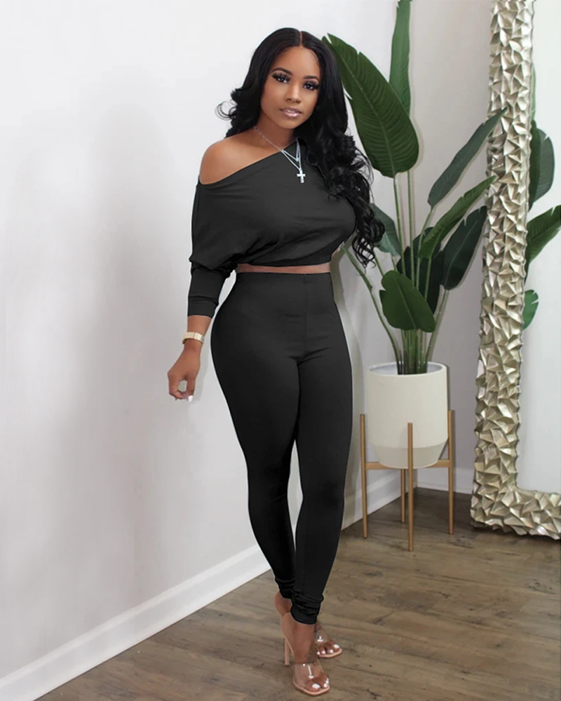 Long Sleeve Elastic Hem Boat Neck Top & Pants Set