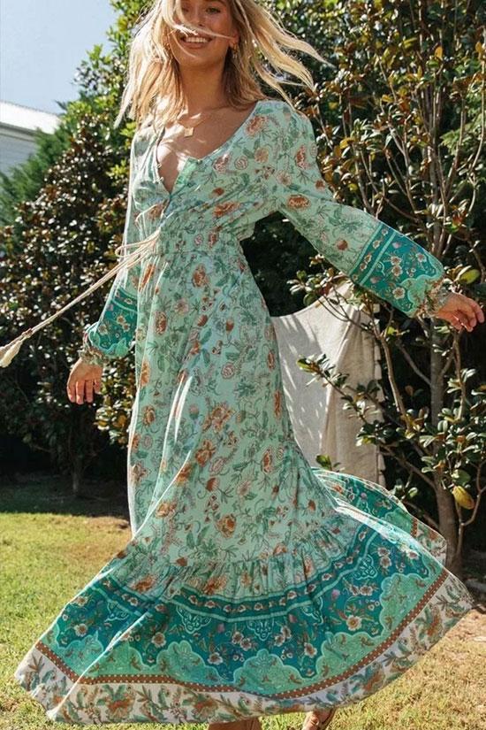 Lounging Bohemian Print Button Front V Neck Maxi Dress