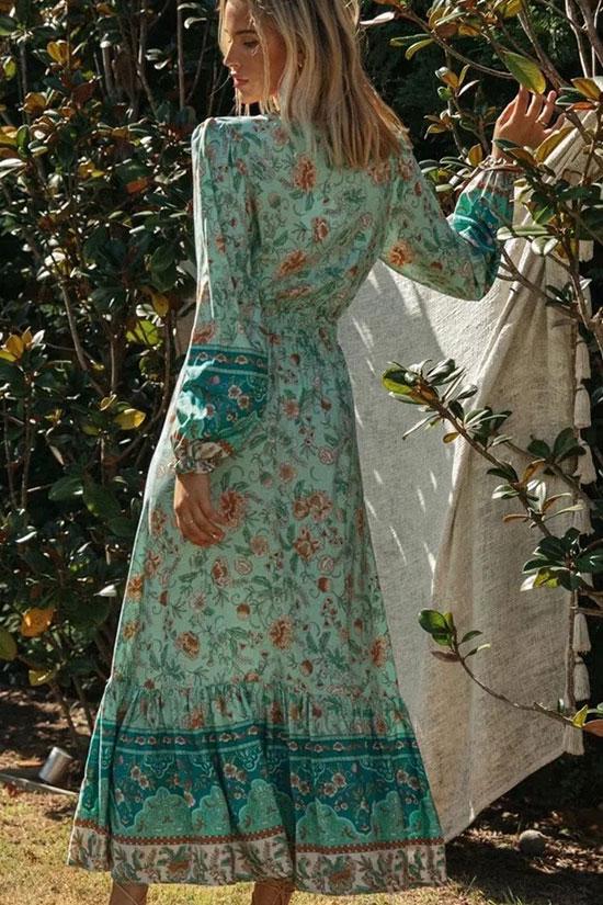 Bohemian style beach dress featuring blend cotton fabric, long sleeves with elastic cuffs, V Neckline with single-breasted trim, drawstring tie with ruched details, flare hemline with stringy-selvedge brim, and maxi length. Choose this patchwork print dress if you plan on lounging around or working from home.