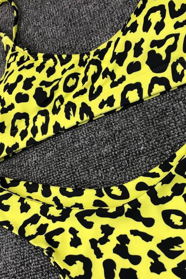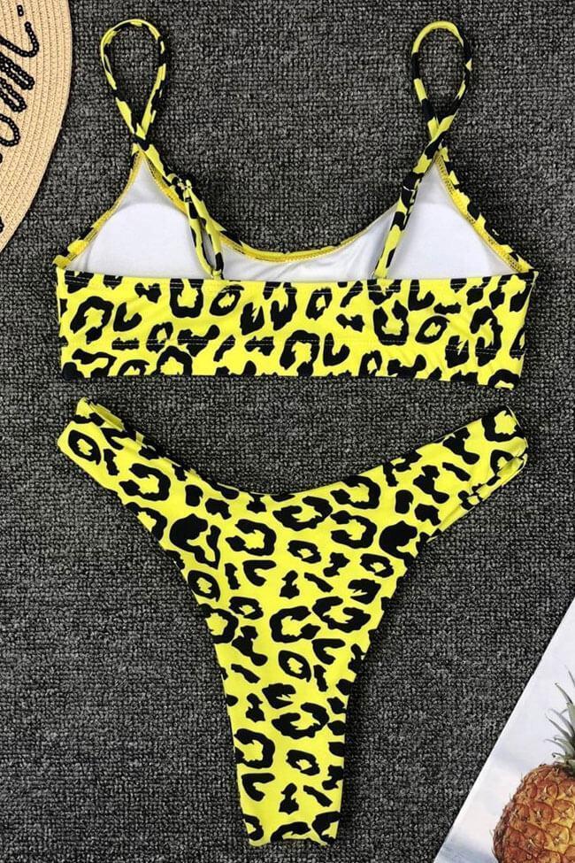 Attractive two piece bikini set featuring a bralette bikini swim top with adjustable shoulder straps, detachable pad cups, elastic band, matching with a high cut bikini thong bottom in cheeky fit. Allover in leopard printed.