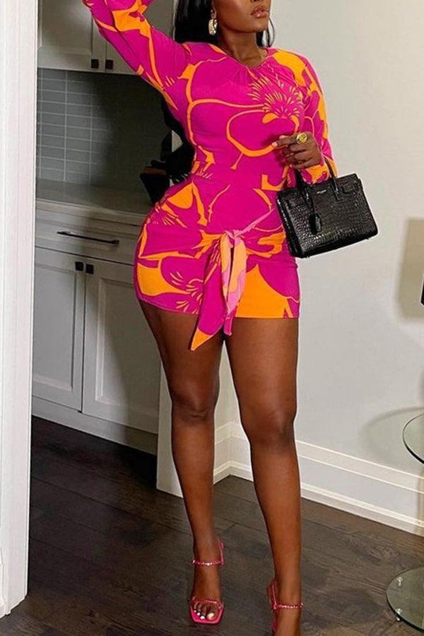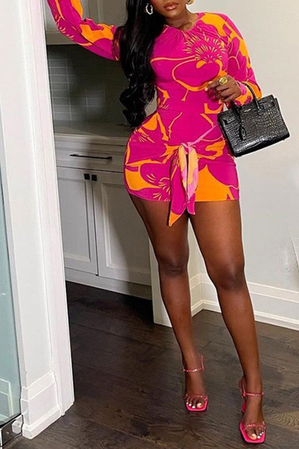 New Lantern Sleeve Digital Printing High Waist Belt Hip Cover Dress